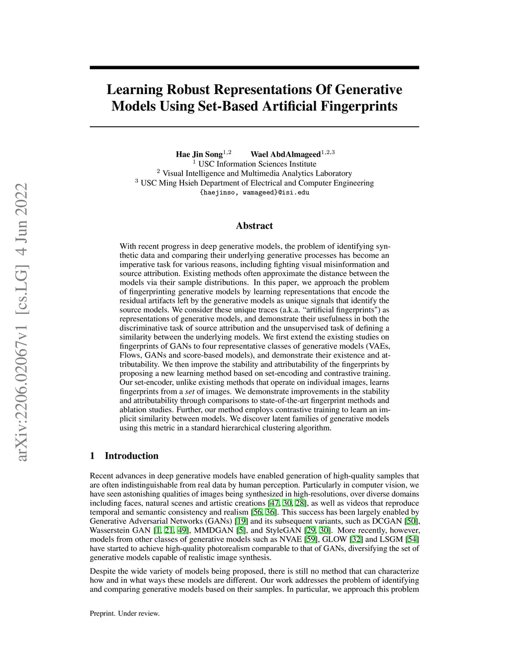 With recent progress in deep generative models, the problem of identifying synthetic data and comparing their underlying generative processes has become an imperative task for various reasons, including fighting visual misinformation and source attribution. Existing methods often approximate the distance between the models via their sample distributions. In this paper, we approach the problem of fingerprinting generative models by learning representations that encode the residual artifacts left by the generative models as unique signals that identify the source models. We consider these unique traces (a.k.a. "artificial fingerprints") as representations of generative models, and demonstrate their usefulness in both the discriminative task of source attribution and the unsupervised task of defining a similarity between the underlying models. We first extend the existing studies on fingerprints of GANs to four representative classes of generative models (VAEs, Flows, GANs and score-based models), and demonstrate their existence and attributability. We then improve the stability and attributability of the fingerprints by proposing a new learning method based on set-encoding and contrastive training. Our set-encoder, unlike existing methods that operate on individual images, learns fingerprints from a \textit{set} of images. We demonstrate improvements in the stability and attributability through comparisons to state-of-the-art fingerprint methods and ablation studies. Further, our method employs contrastive training to learn an implicit similarity between models. We discover latent families of generative models using this metric in a standard hierarchical clustering algorithm.