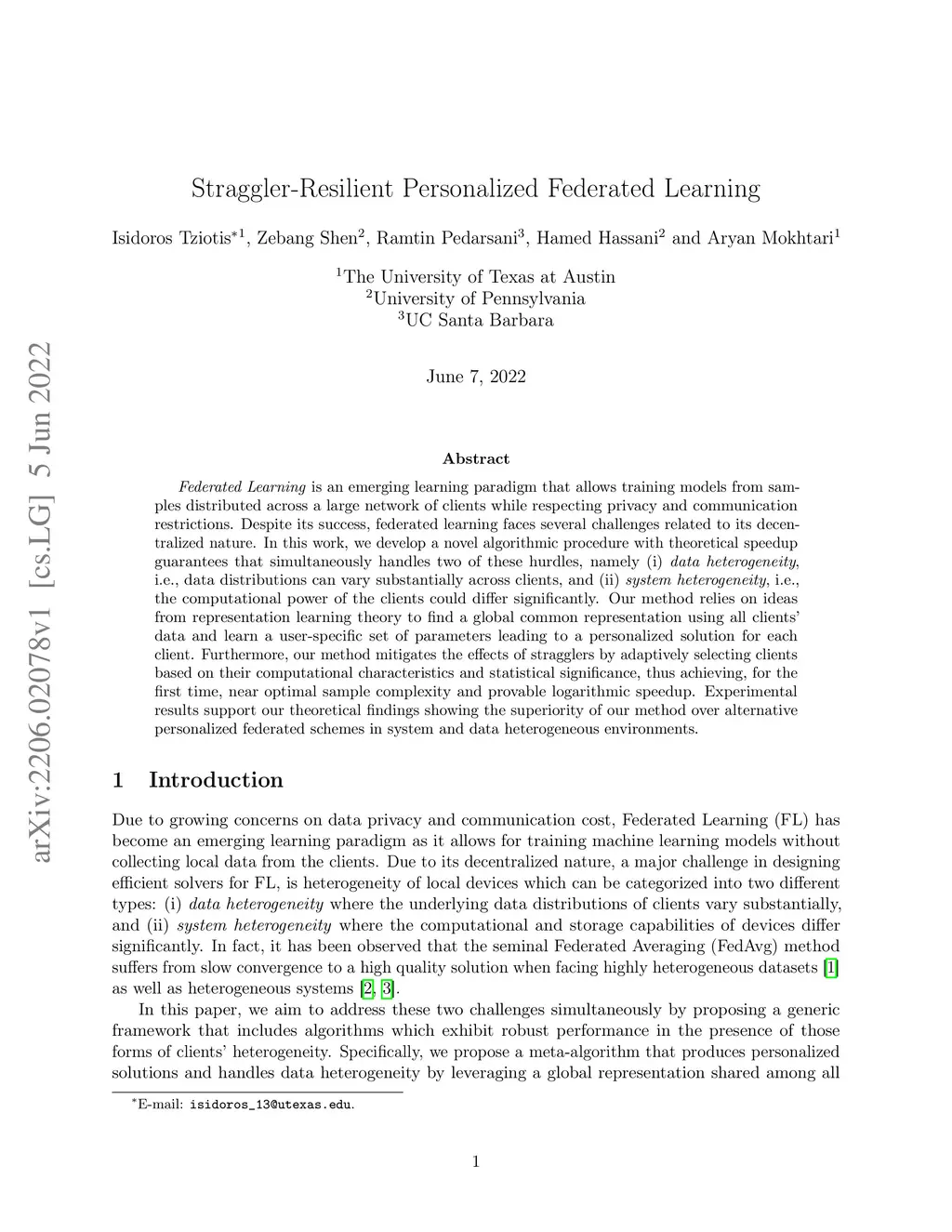 Federated Learning is an emerging learning paradigm that allows training models from samples distributed across a large network of clients while respecting privacy and communication restrictions. Despite its success, federated learning faces several challenges related to its decentralized nature. In this work, we develop a novel algorithmic procedure with theoretical speedup guarantees that simultaneously handles two of these hurdles, namely (i) data heterogeneity, i.e., data distributions can vary substantially across clients, and (ii) system heterogeneity, i.e., the computational power of the clients could differ significantly. Our method relies on ideas from representation learning theory to find a global common representation using all clients' data and learn a user-specific set of parameters leading to a personalized solution for each client. Furthermore, our method mitigates the effects of stragglers by adaptively selecting clients based on their computational characteristics and statistical significance, thus achieving, for the first time, near optimal sample complexity and provable logarithmic speedup. Experimental results support our theoretical findings showing the superiority of our method over alternative personalized federated schemes in system and data heterogeneous environments.