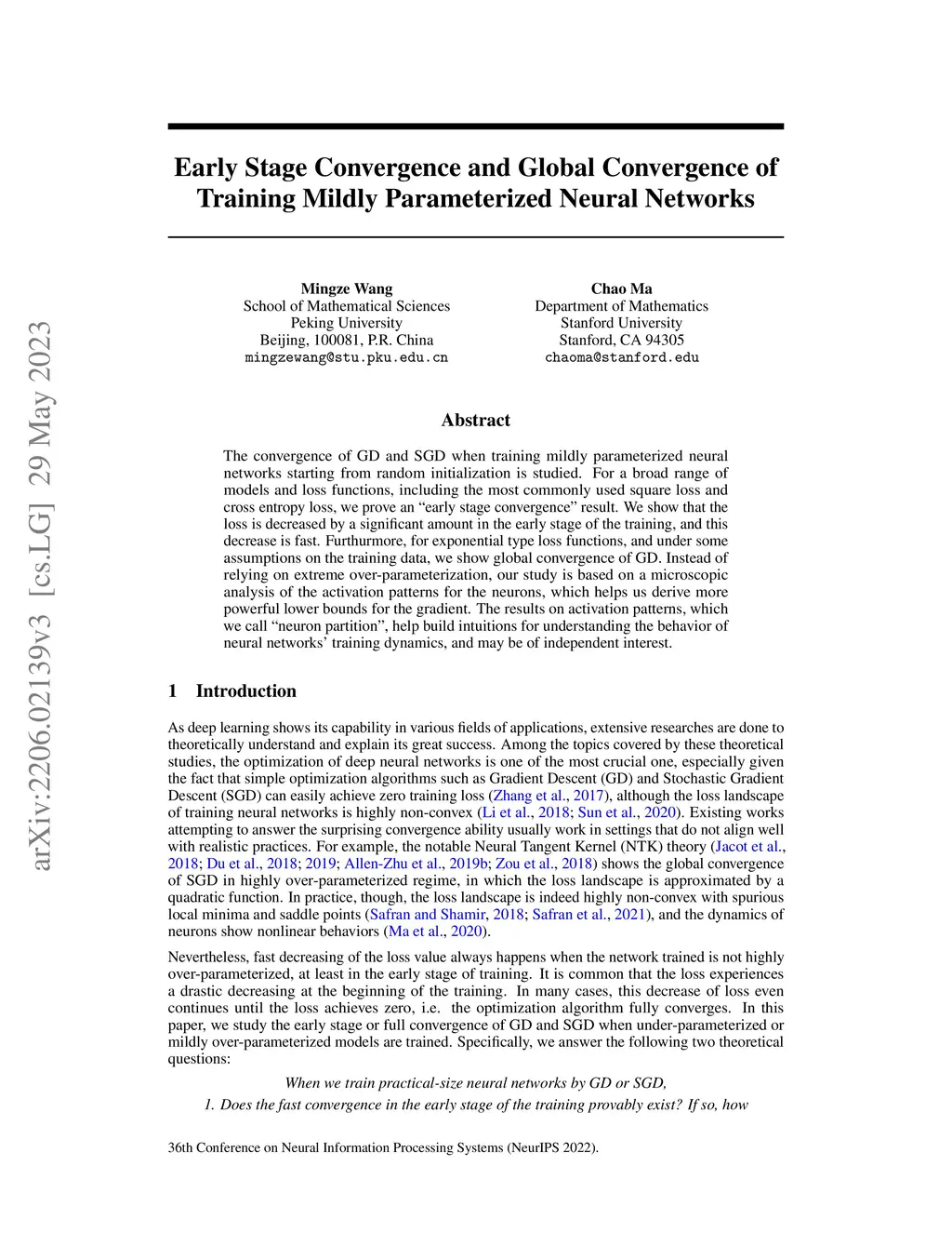 The convergence of GD and SGD when training mildly parameterized neural networks starting from random initialization is studied. For a broad range of models and loss functions, including the most commonly used square loss and cross entropy loss, we prove an ``early stage convergence'' result. We show that the loss is decreased by a significant amount in the early stage of the training, and this decrease is fast. Furthurmore, for exponential type loss functions, and under some assumptions on the training data, we show global convergence of GD. Instead of relying on extreme over-parameterization, our study is based on a microscopic analysis of the activation patterns for the neurons, which helps us derive more powerful lower bounds for the gradient. The results on activation patterns, which we call ``neuron partition'', help build intuitions for understanding the behavior of neural networks' training dynamics, and may be of independent interest.