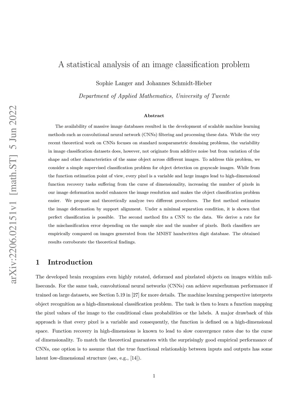 The availability of massive image databases resulted in the development of scalable machine learning methods such as convolutional neural network (CNNs) filtering and processing these data. While the very recent theoretical work on CNNs focuses on standard nonparametric denoising problems, the variability in image classification datasets does, however, not originate from additive noise but from variation of the shape and other characteristics of the same object across different images. To address this problem, we consider a simple supervised classification problem for object detection on grayscale images. While from the function estimation point of view, every pixel is a variable and large images lead to high-dimensional function recovery tasks suffering from the curse of dimensionality, increasing the number of pixels in our image deformation model enhances the image resolution and makes the object classification problem easier. We propose and theoretically analyze two different procedures. The first method estimates the image deformation by support alignment. Under a minimal separation condition, it is shown that perfect classification is possible. The second method fits a CNN to the data. We derive a rate for the misclassification error depending on the sample size and the number of pixels. Both classifiers are empirically compared on images generated from the MNIST handwritten digit database. The obtained results corroborate the theoretical findings.