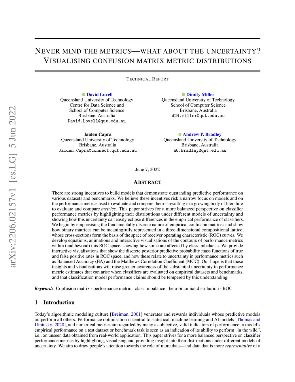 There are strong incentives to build models that demonstrate outstanding predictive performance on various datasets and benchmarks. We believe these incentives risk a narrow focus on models and on the performance metrics used to evaluate and compare them -- resulting in a growing body of literature to evaluate and compare metrics. This paper strives for a more balanced perspective on classifier performance metrics by highlighting their distributions under different models of uncertainty and showing how this uncertainty can easily eclipse differences in the empirical performance of classifiers. We begin by emphasising the fundamentally discrete nature of empirical confusion matrices and show how binary matrices can be meaningfully represented in a three dimensional compositional lattice, whose cross-sections form the basis of the space of receiver operating characteristic (ROC) curves. We develop equations, animations and interactive visualisations of the contours of performance metrics within (and beyond) this ROC space, showing how some are affected by class imbalance. We provide interactive visualisations that show the discrete posterior predictive probability mass functions of true and false positive rates in ROC space, and how these relate to uncertainty in performance metrics such as Balanced Accuracy (BA) and the Matthews Correlation Coefficient (MCC). Our hope is that these insights and visualisations will raise greater awareness of the substantial uncertainty in performance metric estimates that can arise when classifiers are evaluated on empirical datasets and benchmarks, and that classification model performance claims should be tempered by this understanding.
