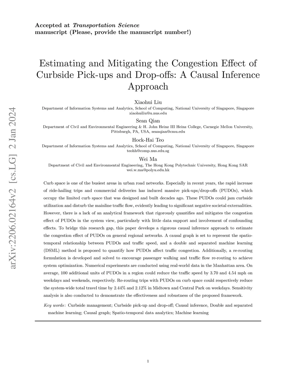 Curb space is one of the busiest areas in urban road networks. Especially in recent years, the rapid increase of ride-hailing trips and commercial deliveries has induced massive pick-ups/drop-offs (PUDOs), which occupy the limited curb space that was designed and built decades ago. These PUDOs could jam curbside utilization and disturb the mainline traffic flow, evidently leading to significant negative societal externalities. However, there is a lack of an analytical framework that rigorously quantifies and mitigates the congestion effect of PUDOs in the system view, particularly with little data support and involvement of confounding effects. To bridge this research gap, this paper develops a rigorous causal inference approach to estimate the congestion effect of PUDOs on general regional networks. A causal graph is set to represent the spatio-temporal relationship between PUDOs and traffic speed, and a double and separated machine learning (DSML) method is proposed to quantify how PUDOs affect traffic congestion. Additionally, a re-routing formulation is developed and solved to encourage passenger walking and traffic flow re-routing to achieve system optimization. Numerical experiments are conducted using real-world data in the Manhattan area. On average, 100 additional units of PUDOs in a region could reduce the traffic speed by 3.70 and 4.54 mph on weekdays and weekends, respectively. Re-routing trips with PUDOs on curb space could respectively reduce the system-wide total travel time by 2.44% and 2.12% in Midtown and Central Park on weekdays. Sensitivity analysis is also conducted to demonstrate the effectiveness and robustness of the proposed framework.