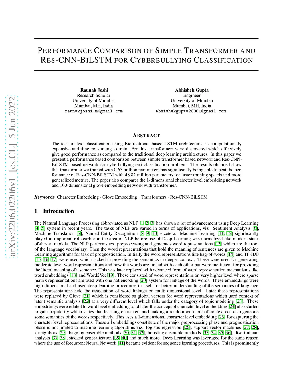 The task of text classification using Bidirectional based LSTM architectures is computationally expensive and time consuming to train. For this, transformers were discovered which effectively give good performance as compared to the traditional deep learning architectures. In this paper we present a performance based comparison between simple transformer based network and Res-CNN-BiLSTM based network for cyberbullying text classification problem. The results obtained show that transformer we trained with 0.65 million parameters has significantly being able to beat the performance of Res-CNN-BiLSTM with 48.82 million parameters for faster training speeds and more generalized metrics. The paper also compares the 1-dimensional character level embedding network and 100-dimensional glove embedding network with transformer.