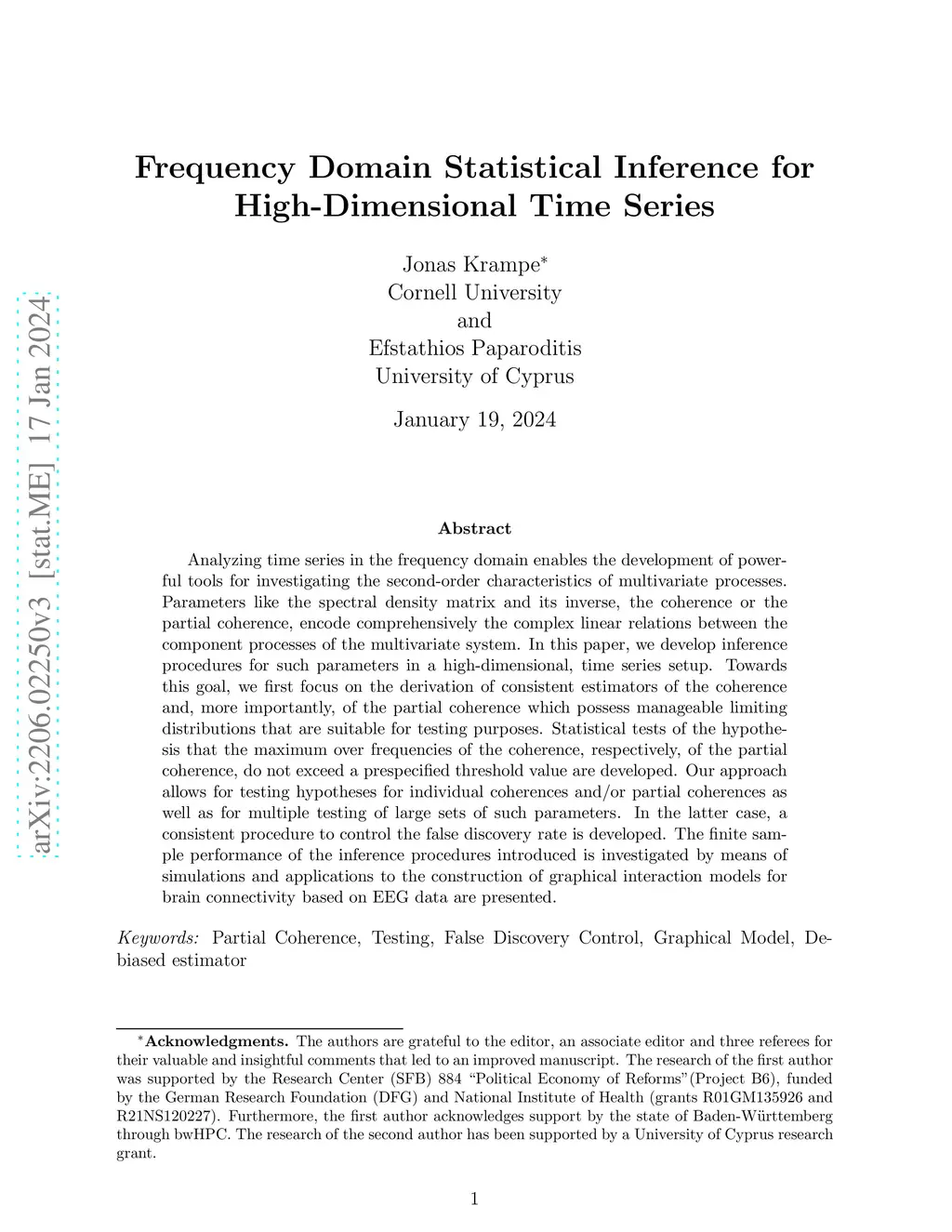 Analyzing time series in the frequency domain enables the development of powerful tools for investigating the second-order characteristics of multivariate processes. Parameters like the spectral density matrix and its inverse, the coherence or the partial coherence, encode comprehensively the complex linear relations between the component processes of the multivariate system. In this paper, we develop inference procedures for such parameters in a high-dimensional, time series setup. Towards this goal, we first focus on the derivation of consistent estimators of the coherence and, more importantly, of the partial coherence which possess manageable limiting distributions that are suitable for testing purposes. Statistical tests of the hypothesis that the maximum over frequencies of the coherence, respectively, of the partial coherence, do not exceed a prespecified threshold value are developed. Our approach allows for testing hypotheses for individual coherences and/or partial coherences as well as for multiple testing of large sets of such parameters. In the latter case, a consistent procedure to control the false discovery rate is developed. The finite sample performance of the inference procedures introduced is investigated by means of simulations and applications to the construction of graphical interaction models for brain connectivity based on EEG data are presented.