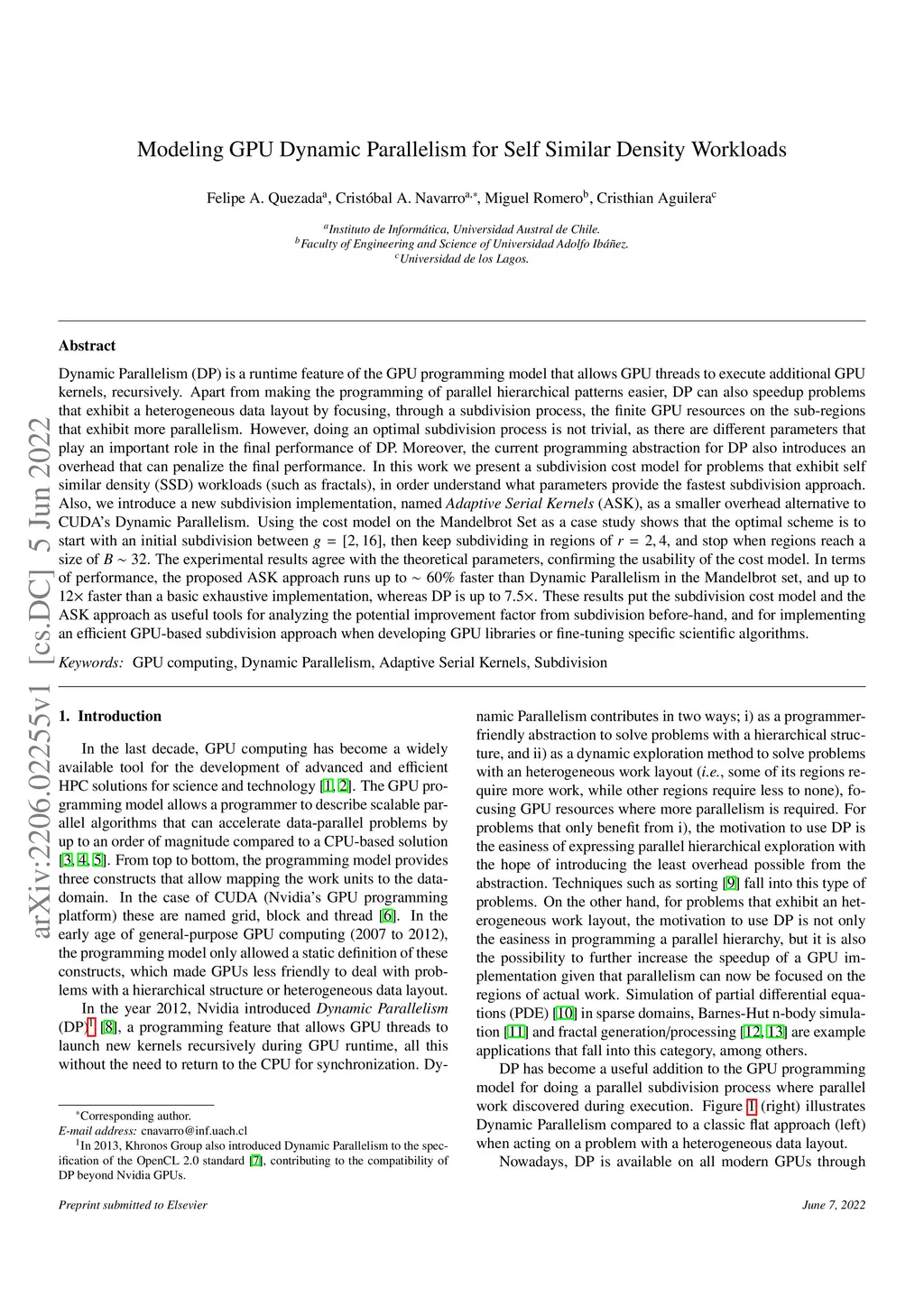 Dynamic Parallelism (DP) is a runtime feature of the GPU programming model that allows GPU threads to execute additional GPU kernels, recursively. Apart from making the programming of parallel hierarchical patterns easier, DP can also speedup problems that exhibit a heterogeneous data layout by focusing, through a subdivision process, the finite GPU resources on the sub-regions that exhibit more parallelism. However, doing an optimal subdivision process is not trivial, as there are different parameters that play an important role in the final performance of DP. Moreover, the current programming abstraction for DP also introduces an overhead that can penalize the final performance. In this work we present a subdivision cost model for problems that exhibit self similar density (SSD) workloads (such as fractals), in order understand what parameters provide the fastest subdivision approach. Also, we introduce a new subdivision implementation, named \textit{Adaptive Serial Kernels} (ASK), as a smaller overhead alternative to CUDA's Dynamic Parallelism. Using the cost model on the Mandelbrot Set as a case study shows that the optimal scheme is to start with an initial subdivision between , then keep subdividing in regions of , and stop when regions reach a size of . The experimental results agree with the theoretical parameters, confirming the usability of the cost model. In terms of performance, the proposed ASK approach runs up to faster than Dynamic Parallelism in the Mandelbrot set, and up to faster than a basic exhaustive implementation, whereas DP is up to .