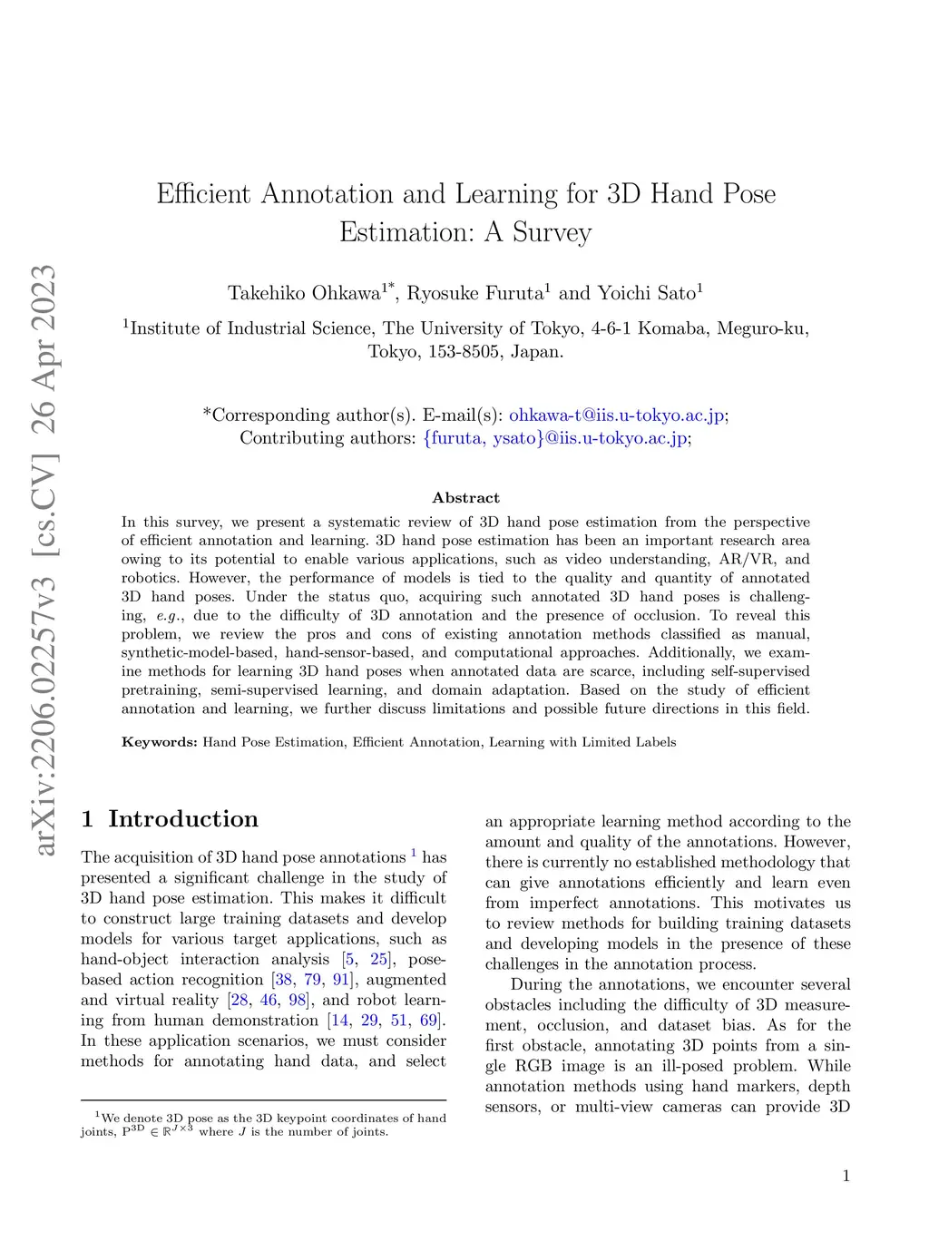 Efficient Annotation and Learning for 3D Hand Pose Estimation: A Survey