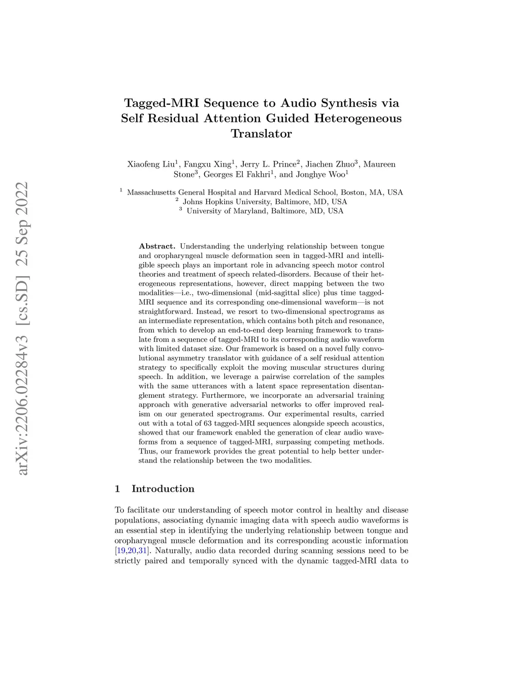 Tagged-MRI Sequence to Audio Synthesis via Self Residual Attention