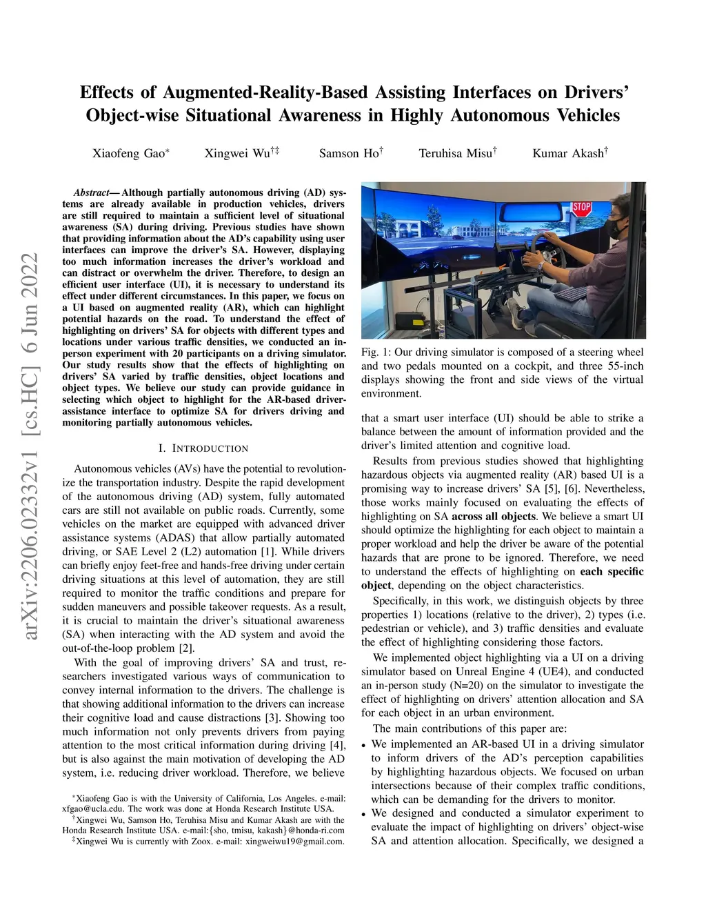 Although partially autonomous driving (AD) systems are already available in production vehicles, drivers are still required to maintain a sufficient level of situational awareness (SA) during driving. Previous studies have shown that providing information about the AD's capability using user interfaces can improve the driver's SA. However, displaying too much information increases the driver's workload and can distract or overwhelm the driver. Therefore, to design an efficient user interface (UI), it is necessary to understand its effect under different circumstances. In this paper, we focus on a UI based on augmented reality (AR), which can highlight potential hazards on the road. To understand the effect of highlighting on drivers' SA for objects with different types and locations under various traffic densities, we conducted an in-person experiment with 20 participants on a driving simulator. Our study results show that the effects of highlighting on drivers' SA varied by traffic densities, object locations and object types. We believe our study can provide guidance in selecting which object to highlight for the AR-based driver-assistance interface to optimize SA for drivers driving and monitoring partially autonomous vehicles.