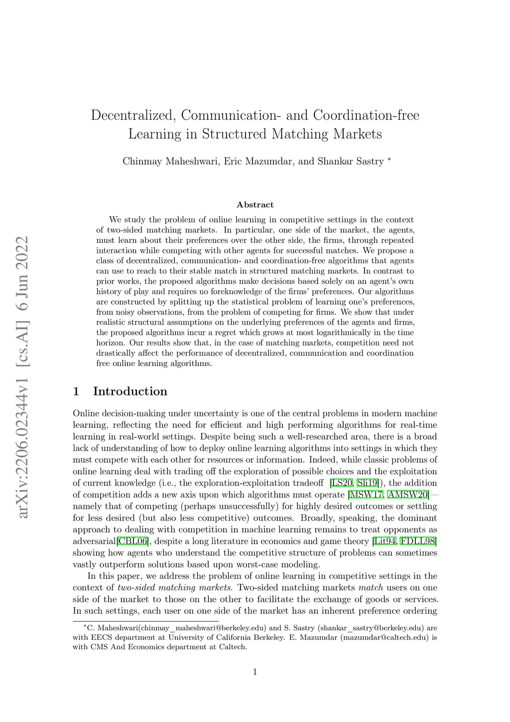 We study the problem of online learning in competitive settings in the context of two-sided matching markets. In particular, one side of the market, the agents, must learn about their preferences over the other side, the firms, through repeated interaction while competing with other agents for successful matches. We propose a class of decentralized, communication- and coordination-free algorithms that agents can use to reach to their stable match in structured matching markets. In contrast to prior works, the proposed algorithms make decisions based solely on an agent's own history of play and requires no foreknowledge of the firms' preferences. Our algorithms are constructed by splitting up the statistical problem of learning one's preferences, from noisy observations, from the problem of competing for firms. We show that under realistic structural assumptions on the underlying preferences of the agents and firms, the proposed algorithms incur a regret which grows at most logarithmically in the time horizon. Our results show that, in the case of matching markets, competition need not drastically affect the performance of decentralized, communication and coordination free online learning algorithms.