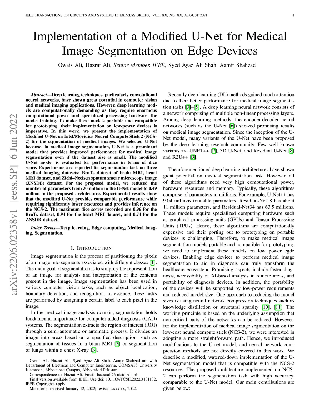 Deep learning techniques, particularly convolutional neural networks, have shown great potential in computer vision and medical imaging applications. However, deep learning models are computationally demanding as they require enormous computational power and specialized processing hardware for model training. To make these models portable and compatible for prototyping, their implementation on low-power devices is imperative. In this work, we present the implementation of Modified U-Net on Intel Movidius Neural Compute Stick 2 (NCS-2) for the segmentation of medical images. We selected U-Net because, in medical image segmentation, U-Net is a prominent model that provides improved performance for medical image segmentation even if the dataset size is small. The modified U-Net model is evaluated for performance in terms of dice score. Experiments are reported for segmentation task on three medical imaging datasets: BraTs dataset of brain MRI, heart MRI dataset, and Ziehl-Neelsen sputum smear microscopy image (ZNSDB) dataset. For the proposed model, we reduced the number of parameters from 30 million in the U-Net model to 0.49 million in the proposed architecture. Experimental results show that the modified U-Net provides comparable performance while requiring significantly lower resources and provides inference on the NCS-2. The maximum dice scores recorded are 0.96 for the BraTs dataset, 0.94 for the heart MRI dataset, and 0.74 for the ZNSDB dataset.