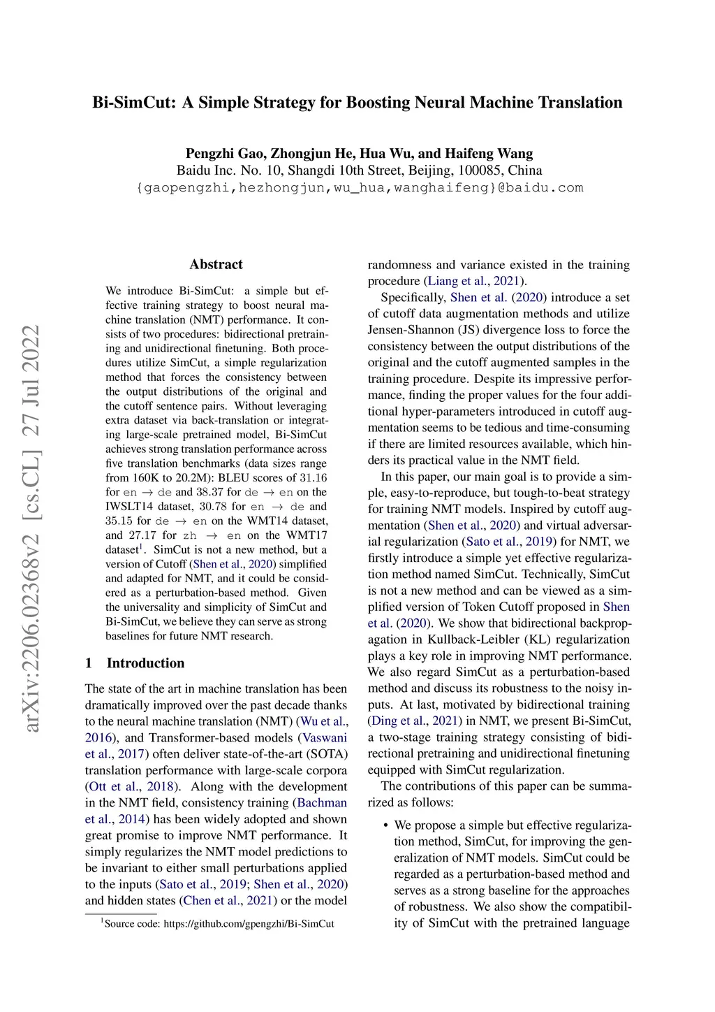 We introduce Bi-SimCut: a simple but effective training strategy to boost neural machine translation (NMT) performance. It consists of two procedures: bidirectional pretraining and unidirectional finetuning. Both procedures utilize SimCut, a simple regularization method that forces the consistency between the output distributions of the original and the cutoff sentence pairs. Without leveraging extra dataset via back-translation or integrating large-scale pretrained model, Bi-SimCut achieves strong translation performance across five translation benchmarks (data sizes range from 160K to 20.2M): BLEU scores of 31.16 for en -> de and 38.37 for de -> en on the IWSLT14 dataset, 30.78 for en -> de and 35.15 for de -> en on the WMT14 dataset, and 27.17 for zh -> en on the WMT17 dataset. SimCut is not a new method, but a version of Cutoff (Shen et al., 2020) simplified and adapted for NMT, and it could be considered as a perturbation-based method. Given the universality and simplicity of SimCut and Bi-SimCut, we believe they can serve as strong baselines for future NMT research.