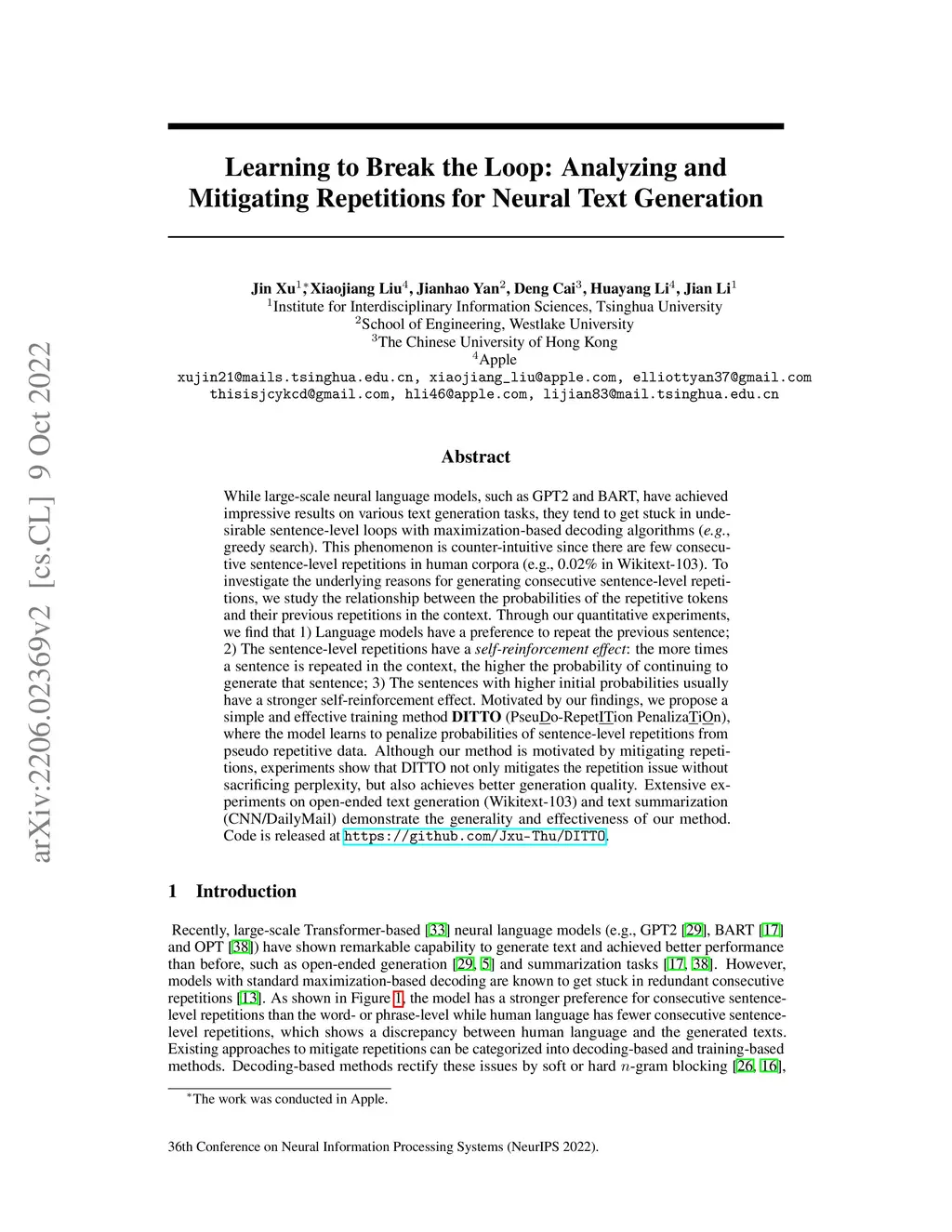While large-scale neural language models, such as GPT2 and BART, have achieved impressive results on various text generation tasks, they tend to get stuck in undesirable sentence-level loops with maximization-based decoding algorithms (\textit{e.g.}, greedy search). This phenomenon is counter-intuitive since there are few consecutive sentence-level repetitions in human corpora (e.g., 0.02\% in Wikitext-103). To investigate the underlying reasons for generating consecutive sentence-level repetitions, we study the relationship between the probabilities of the repetitive tokens and their previous repetitions in the context. Through our quantitative experiments, we find that 1) Language models have a preference to repeat the previous sentence; 2) The sentence-level repetitions have a \textit{self-reinforcement effect}: the more times a sentence is repeated in the context, the higher the probability of continuing to generate that sentence; 3) The sentences with higher initial probabilities usually have a stronger self-reinforcement effect. Motivated by our findings, we propose a simple and effective training method \textbf{DITTO} (Pseu\underline{D}o-Repet\underline{IT}ion Penaliza\underline{T}i\underline{O}n), where the model learns to penalize probabilities of sentence-level repetitions from pseudo repetitive data. Although our method is motivated by mitigating repetitions, experiments show that DITTO not only mitigates the repetition issue without sacrificing perplexity, but also achieves better generation quality. Extensive experiments on open-ended text generation (Wikitext-103) and text summarization (CNN/DailyMail) demonstrate the generality and effectiveness of our method.