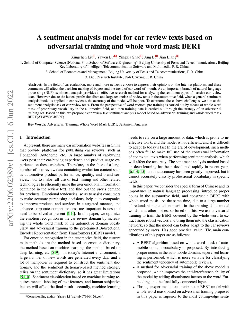A sentiment analysis model for car review texts based on adversarial