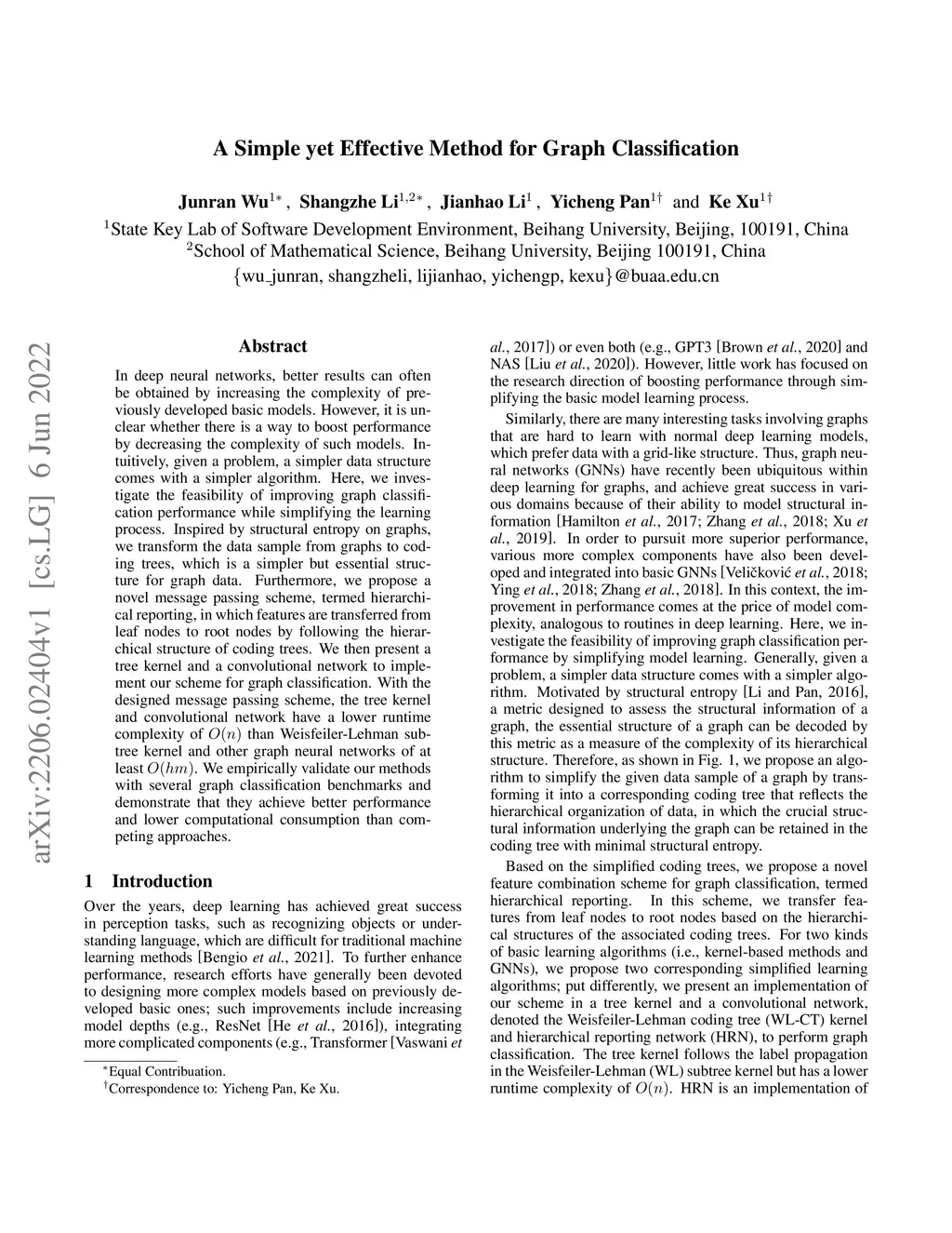 In deep neural networks, better results can often be obtained by increasing the complexity of previously developed basic models. However, it is unclear whether there is a way to boost performance by decreasing the complexity of such models. Intuitively, given a problem, a simpler data structure comes with a simpler algorithm. Here, we investigate the feasibility of improving graph classification performance while simplifying the learning process. Inspired by structural entropy on graphs, we transform the data sample from graphs to coding trees, which is a simpler but essential structure for graph data. Furthermore, we propose a novel message passing scheme, termed hierarchical reporting, in which features are transferred from leaf nodes to root nodes by following the hierarchical structure of coding trees. We then present a tree kernel and a convolutional network to implement our scheme for graph classification. With the designed message passing scheme, the tree kernel and convolutional network have a lower runtime complexity of than Weisfeiler-Lehman subtree kernel and other graph neural networks of at least . We empirically validate our methods with several graph classification benchmarks and demonstrate that they achieve better performance and lower computational consumption than competing approaches.