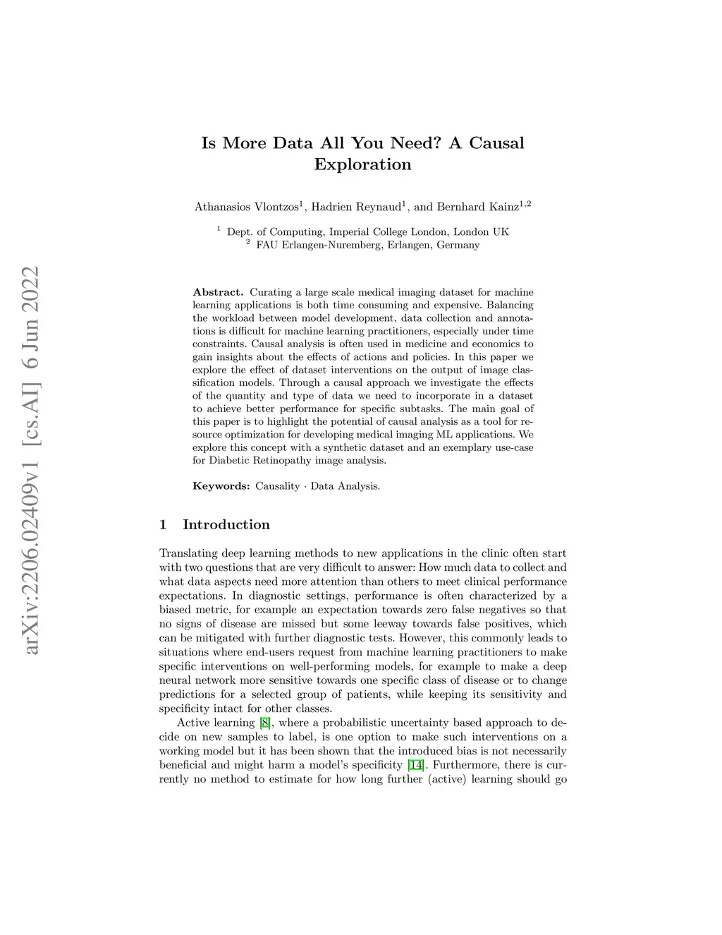Curating a large scale medical imaging dataset for machine learning applications is both time consuming and expensive. Balancing the workload between model development, data collection and annotations is difficult for machine learning practitioners, especially under time constraints. Causal analysis is often used in medicine and economics to gain insights about the effects of actions and policies. In this paper we explore the effect of dataset interventions on the output of image classification models. Through a causal approach we investigate the effects of the quantity and type of data we need to incorporate in a dataset to achieve better performance for specific subtasks. The main goal of this paper is to highlight the potential of causal analysis as a tool for resource optimization for developing medical imaging ML applications. We explore this concept with a synthetic dataset and an exemplary use-case for Diabetic Retinopathy image analysis.