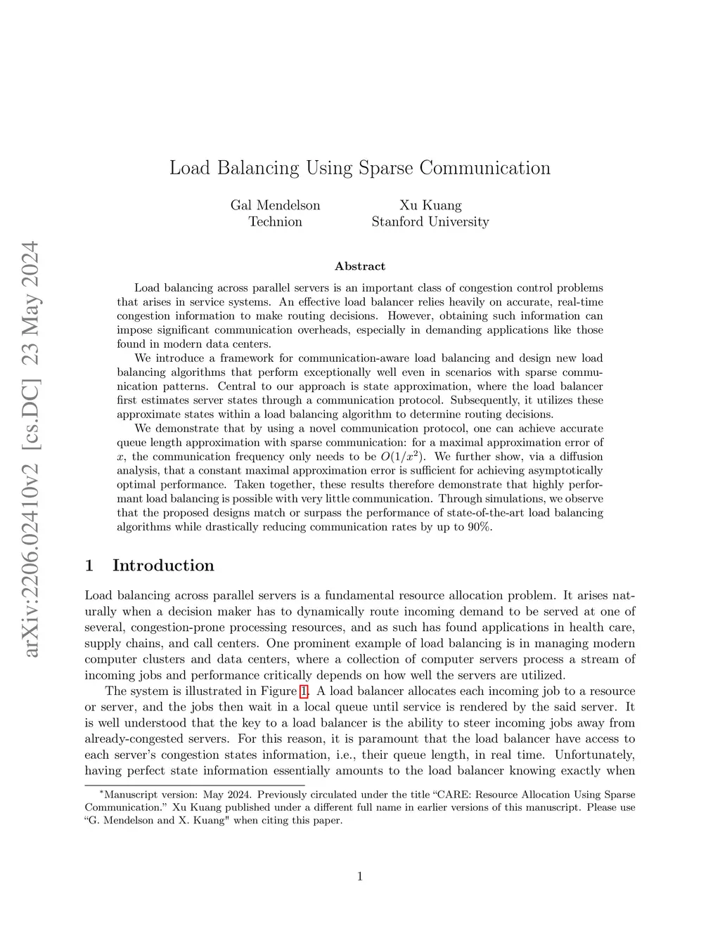 Load balancing across parallel servers is an important class of congestion control problems that arises in service systems. An effective load balancer relies heavily on accurate, real-time congestion information to make routing decisions. However, obtaining such information can impose significant communication overheads, especially in demanding applications like those found in modern data centers. We introduce a framework for communication-aware load balancing and design new load balancing algorithms that perform exceptionally well even in scenarios with sparse communication patterns. Central to our approach is state approximation, where the load balancer first estimates server states through a communication protocol. Subsequently, it utilizes these approximate states within a load balancing algorithm to determine routing decisions. We demonstrate that by using a novel communication protocol, one can achieve accurate queue length approximation with sparse communication: for a maximal approximation error of x, the communication frequency only needs to be O(1/x^2). We further show, via a diffusion analysis, that a constant maximal approximation error is sufficient for achieving asymptotically optimal performance. Taken together, these results therefore demonstrate that highly performant load balancing is possible with very little communication. Through simulations, we observe that the proposed designs match or surpass the performance of state-of-the-art load balancing algorithms while drastically reducing communication rates by up to 90%.