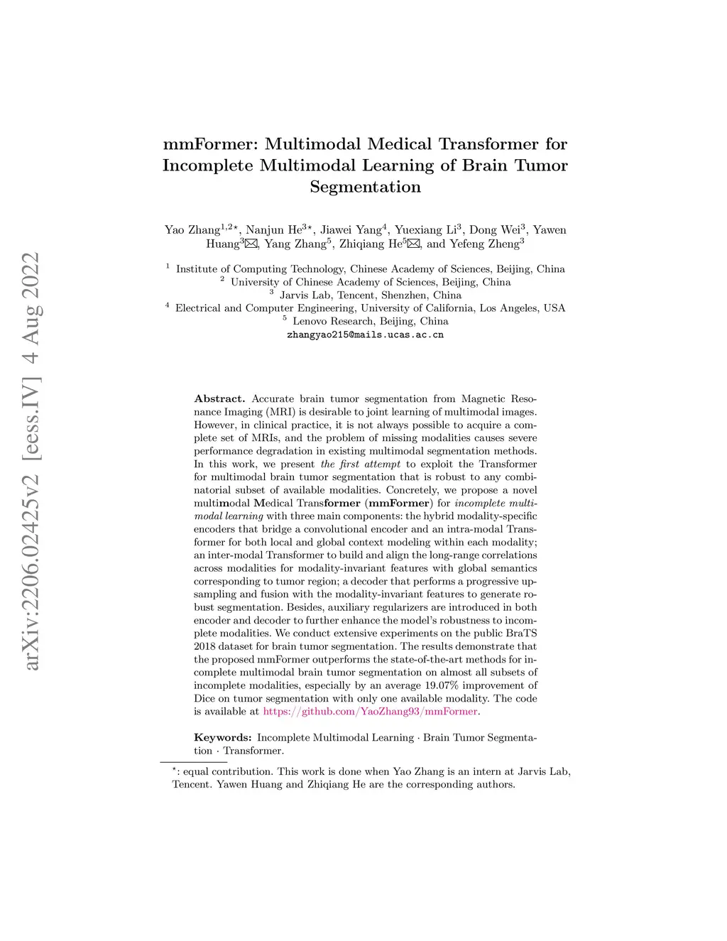 mmFormer: Multimodal Medical Transformer for Incomplete Multimodal