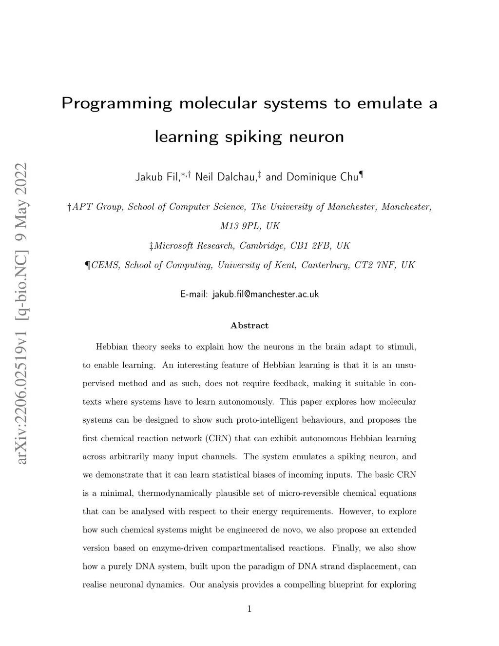 Hebbian theory seeks to explain how the neurons in the brain adapt to stimuli, to enable learning. An interesting feature of Hebbian learning is that it is an unsupervised method and as such, does not require feedback, making it suitable in contexts where systems have to learn autonomously. This paper explores how molecular systems can be designed to show such proto-intelligent behaviours, and proposes the first chemical reaction network (CRN) that can exhibit autonomous Hebbian learning across arbitrarily many input channels. The system emulates a spiking neuron, and we demonstrate that it can learn statistical biases of incoming inputs. The basic CRN is a minimal, thermodynamically plausible set of micro-reversible chemical equations that can be analysed with respect to their energy requirements. However, to explore how such chemical systems might be engineered de novo, we also propose an extended version based on enzyme-driven compartmentalised reactions. Finally, we also show how a purely DNA system, built upon the paradigm of DNA strand displacement, can realise neuronal dynamics. Our analysis provides a compelling blueprint for exploring autonomous learning in biological settings, bringing us closer to realising real synthetic biological intelligence.