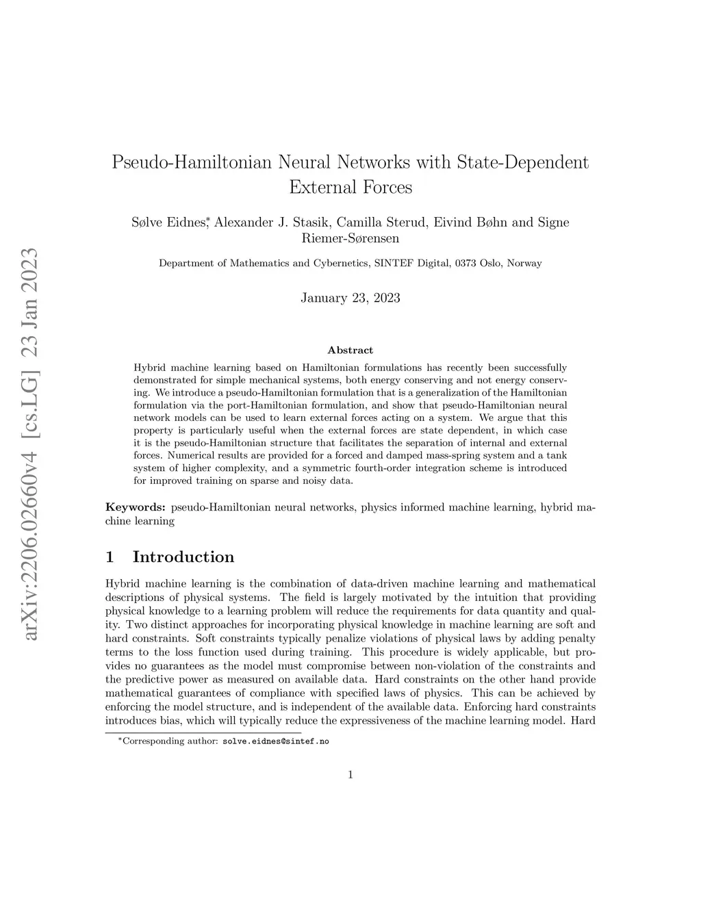 Hybrid machine learning based on Hamiltonian formulations has recently been successfully demonstrated for simple mechanical systems, both energy conserving and not energy conserving. We introduce a pseudo-Hamiltonian formulation that is a generalization of the Hamiltonian formulation via the port-Hamiltonian formulation, and show that pseudo-Hamiltonian neural network models can be used to learn external forces acting on a system. We argue that this property is particularly useful when the external forces are state dependent, in which case it is the pseudo-Hamiltonian structure that facilitates the separation of internal and external forces. Numerical results are provided for a forced and damped mass-spring system and a tank system of higher complexity, and a symmetric fourth-order integration scheme is introduced for improved training on sparse and noisy data.