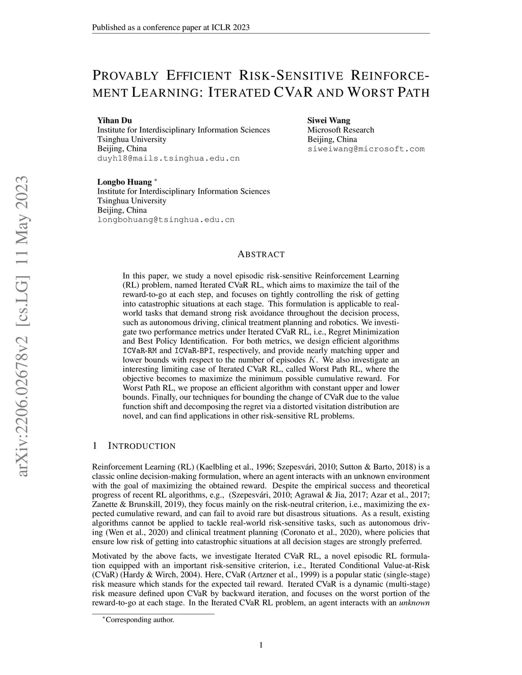 In this paper, we study a novel episodic risk-sensitive Reinforcement Learning (RL) problem, named Iterated CVaR RL, which aims to maximize the tail of the reward-to-go at each step, and focuses on tightly controlling the risk of getting into catastrophic situations at each stage. This formulation is applicable to real-world tasks that demand strong risk avoidance throughout the decision process, such as autonomous driving, clinical treatment planning and robotics. We investigate two performance metrics under Iterated CVaR RL, i.e., Regret Minimization and Best Policy Identification. For both metrics, we design efficient algorithms ICVaR-RM and ICVaR-BPI, respectively, and provide nearly matching upper and lower bounds with respect to the number of episodes . We also investigate an interesting limiting case of Iterated CVaR RL, called Worst Path RL, where the objective becomes to maximize the minimum possible cumulative reward. For Worst Path RL, we propose an efficient algorithm with constant upper and lower bounds. Finally, our techniques for bounding the change of CVaR due to the value function shift and decomposing the regret via a distorted visitation distribution are novel, and can find applications in other risk-sensitive RL problems.