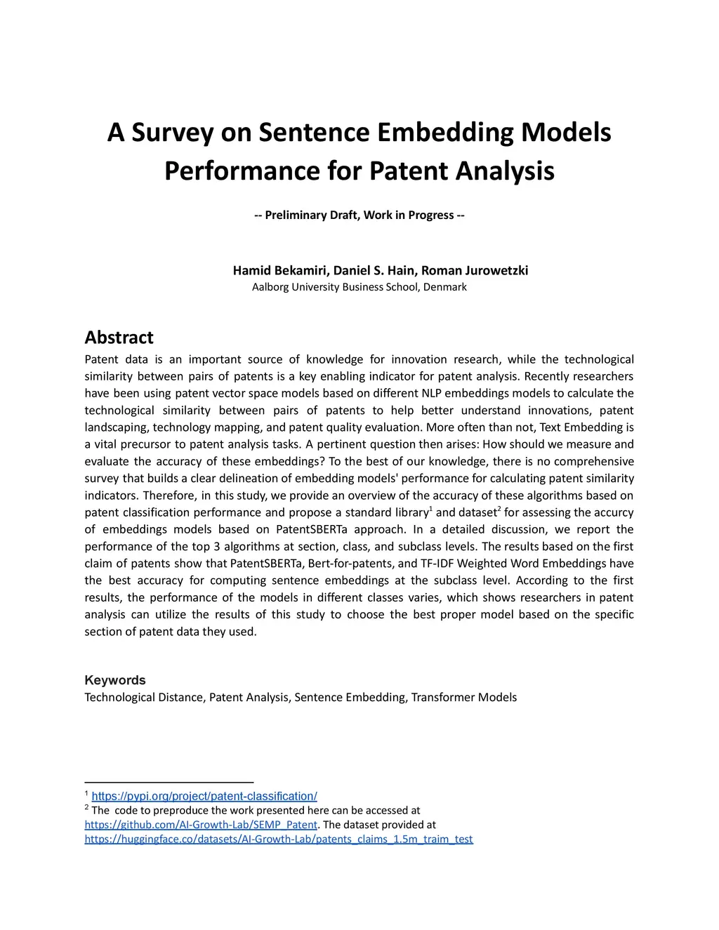 A Survey on Sentence Embedding Models Performance for Patent Analysis