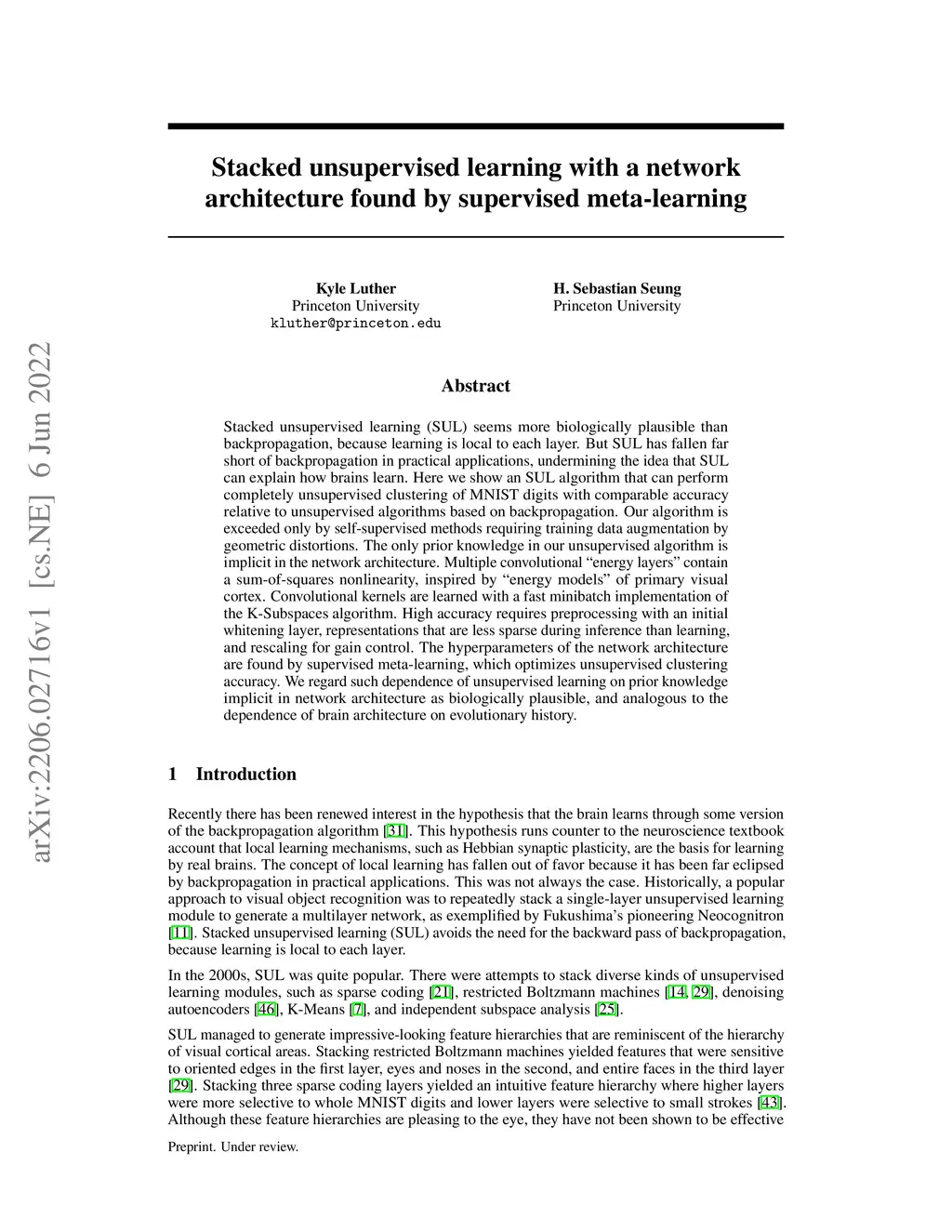 Stacked unsupervised learning (SUL) seems more biologically plausible than backpropagation, because learning is local to each layer. But SUL has fallen far short of backpropagation in practical applications, undermining the idea that SUL can explain how brains learn. Here we show an SUL algorithm that can perform completely unsupervised clustering of MNIST digits with comparable accuracy relative to unsupervised algorithms based on backpropagation. Our algorithm is exceeded only by self-supervised methods requiring training data augmentation by geometric distortions. The only prior knowledge in our unsupervised algorithm is implicit in the network architecture. Multiple convolutional "energy layers" contain a sum-of-squares nonlinearity, inspired by "energy models" of primary visual cortex. Convolutional kernels are learned with a fast minibatch implementation of the K-Subspaces algorithm. High accuracy requires preprocessing with an initial whitening layer, representations that are less sparse during inference than learning, and rescaling for gain control. The hyperparameters of the network architecture are found by supervised meta-learning, which optimizes unsupervised clustering accuracy. We regard such dependence of unsupervised learning on prior knowledge implicit in network architecture as biologically plausible, and analogous to the dependence of brain architecture on evolutionary history.