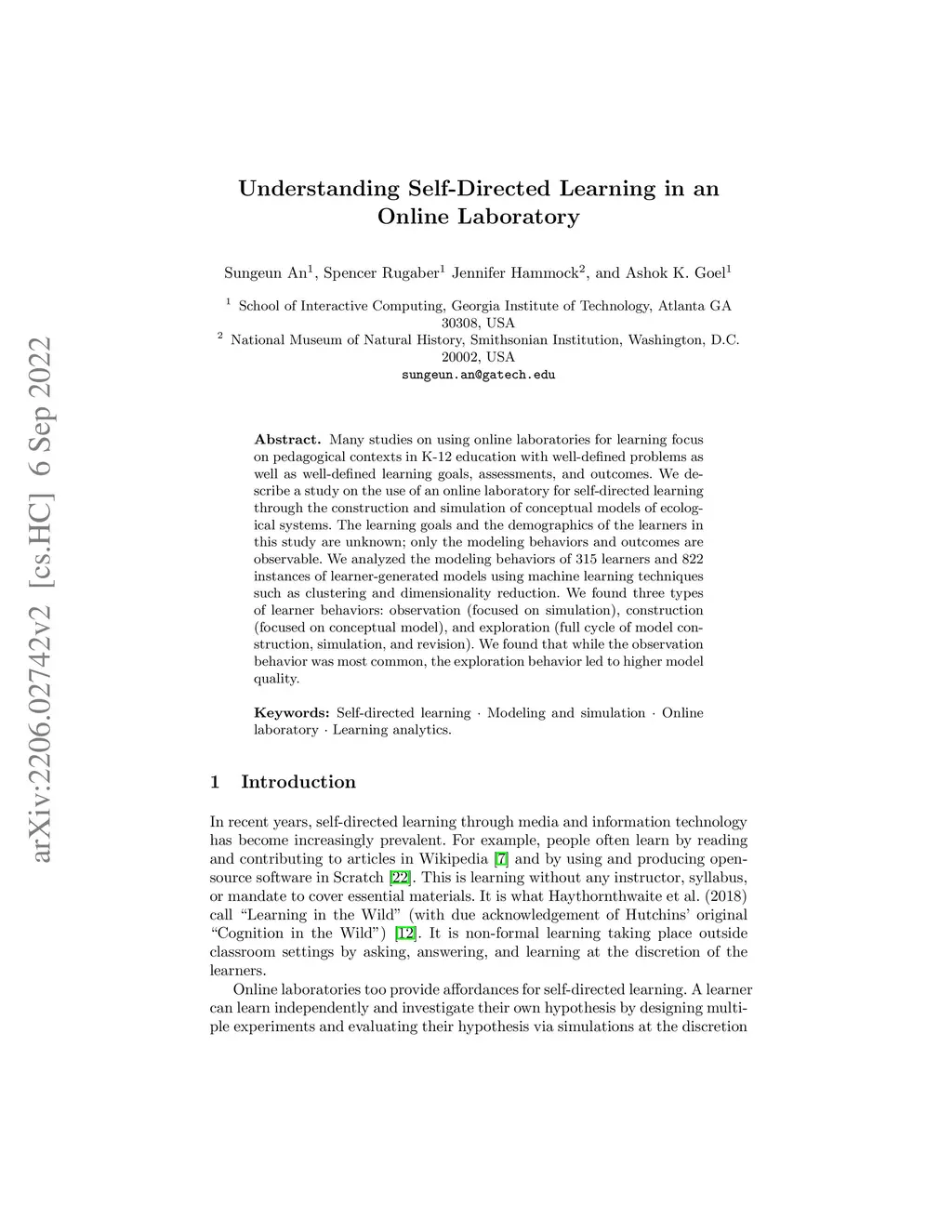 We described a study on the use of an online laboratory for self-directed learning by constructing and simulating conceptual models of ecological systems. In this study, we could observe only the modeling behaviors and outcomes; the learning goals and outcomes were unknown. We used machine learning techniques to analyze the modeling behaviors of 315 learners and 822 conceptual models they generated. We derive three main conclusions from the results. First, learners manifest three types of modeling behaviors: observation (simulation focused), construction (construction focused), and full exploration (model construction, evaluation and revision). Second, while observation was the most common behavior among all learners, construction without evaluation was more common for less engaged learners and full exploration occurred mostly for more engaged learners. Third, learners who explored the full cycle of model construction, evaluation and revision generated models of higher quality. These modeling behaviors provide insights into self-directed learning at large.