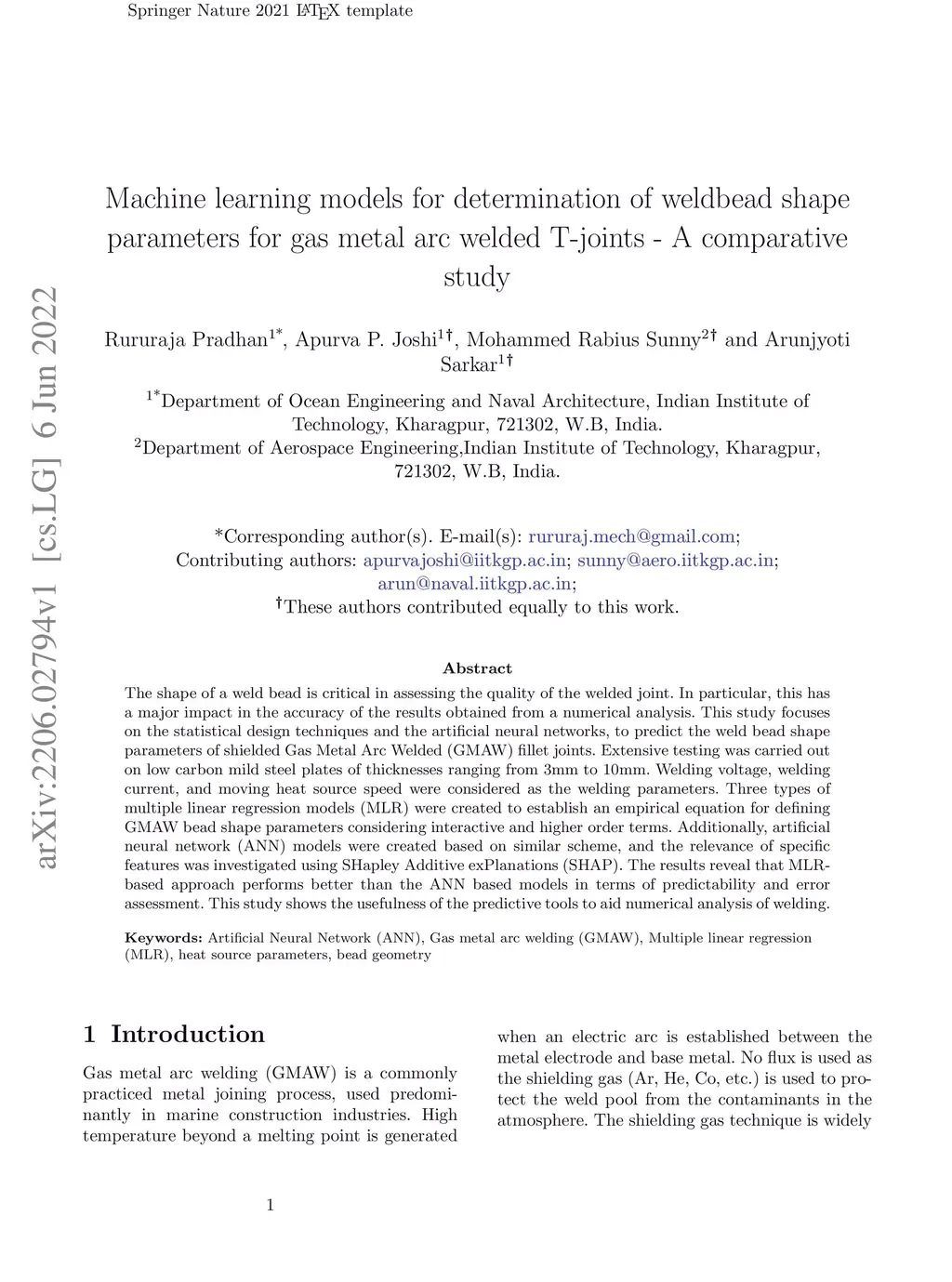 The shape of a weld bead is critical in assessing the quality of the welded joint. In particular, this has a major impact in the accuracy of the results obtained from a numerical analysis. This study focuses on the statistical design techniques and the artificial neural networks, to predict the weld bead shape parameters of shielded Gas Metal Arc Welded (GMAW) fillet joints. Extensive testing was carried out on low carbon mild steel plates of thicknesses ranging from 3mm to 10mm. Welding voltage, welding current, and moving heat source speed were considered as the welding parameters. Three types of multiple linear regression models (MLR) were created to establish an empirical equation for defining GMAW bead shape parameters considering interactive and higher order terms. Additionally, artificial neural network (ANN) models were created based on similar scheme, and the relevance of specific features was investigated using SHapley Additive exPlanations (SHAP). The results reveal that MLR-based approach performs better than the ANN based models in terms of predictability and error assessment. This study shows the usefulness of the predictive tools to aid numerical analysis of welding.