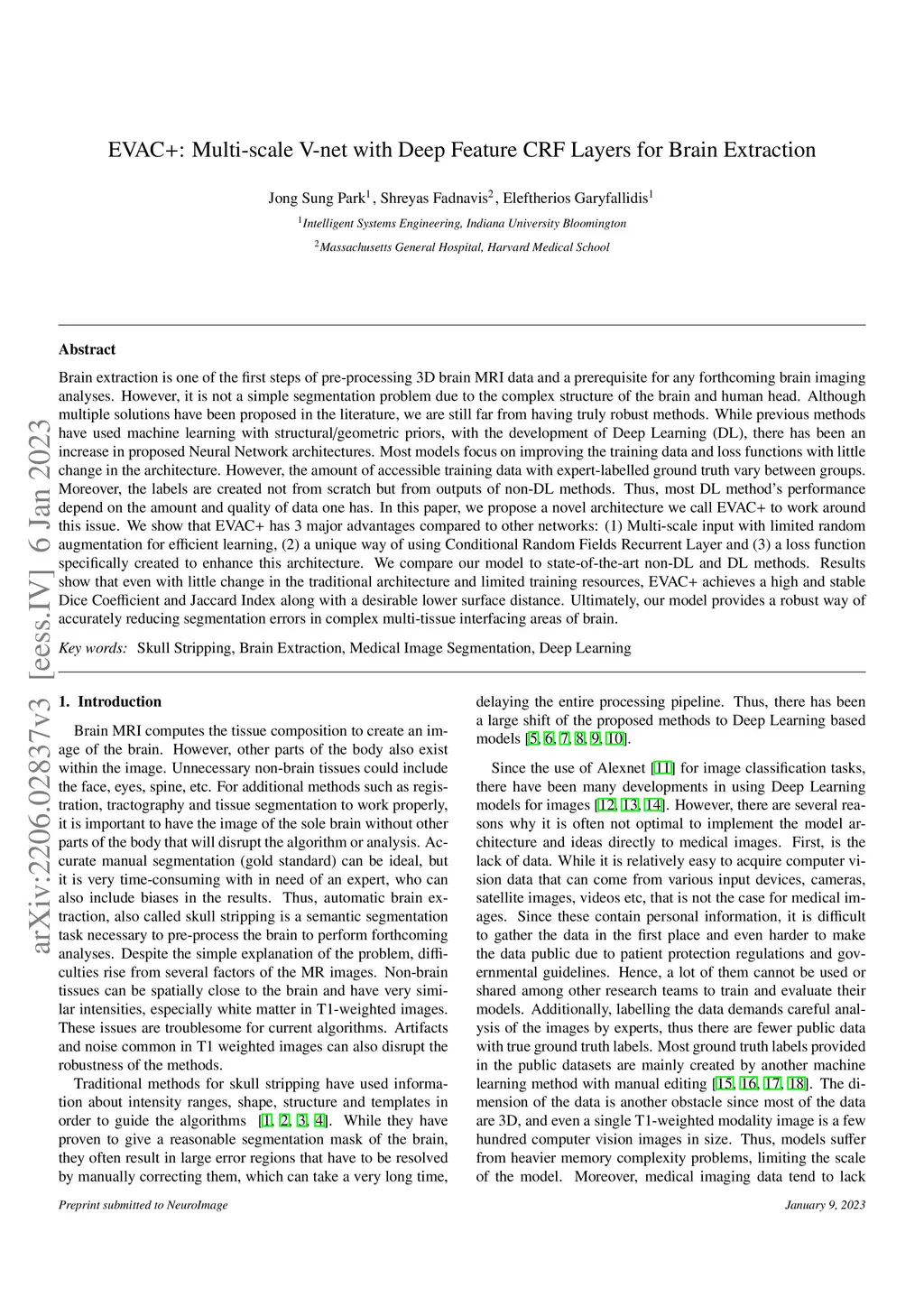 Brain extraction is one of the first steps of pre-processing 3D brain MRI data and a prerequisite for any forthcoming brain imaging analyses. However, it is not a simple segmentation problem due to the complex structure of the brain and human head. Although multiple solutions have been proposed in the literature, we are still far from having truly robust methods. While previous methods have used machine learning with structural/geometric priors, with the development of Deep Learning (DL), there has been an increase in proposed Neural Network architectures. Most models focus on improving the training data and loss functions with little change in the architecture. However, the amount of accessible training data with expert-labelled ground truth vary between groups. Moreover, the labels are created not from scratch but from outputs of non-DL methods. Thus, most DL method's performance depend on the amount and quality of data one has. In this paper, we propose a novel architecture we call EVAC+ to work around this issue. We show that EVAC+ has 3 major advantages compared to other networks: (1) Multi-scale input with limited random augmentation for efficient learning, (2) a unique way of using Conditional Random Fields Recurrent Layer and (3) a loss function specifically created to enhance this architecture. We compare our model to state-of-the-art non-DL and DL methods. Results show that even with little change in the traditional architecture and limited training resources, EVAC+ achieves a high and stable Dice Coefficient and Jaccard Index along with a desirable lower surface distance. Ultimately, our model provides a robust way of accurately reducing segmentation errors in complex multi-tissue interfacing areas of brain.