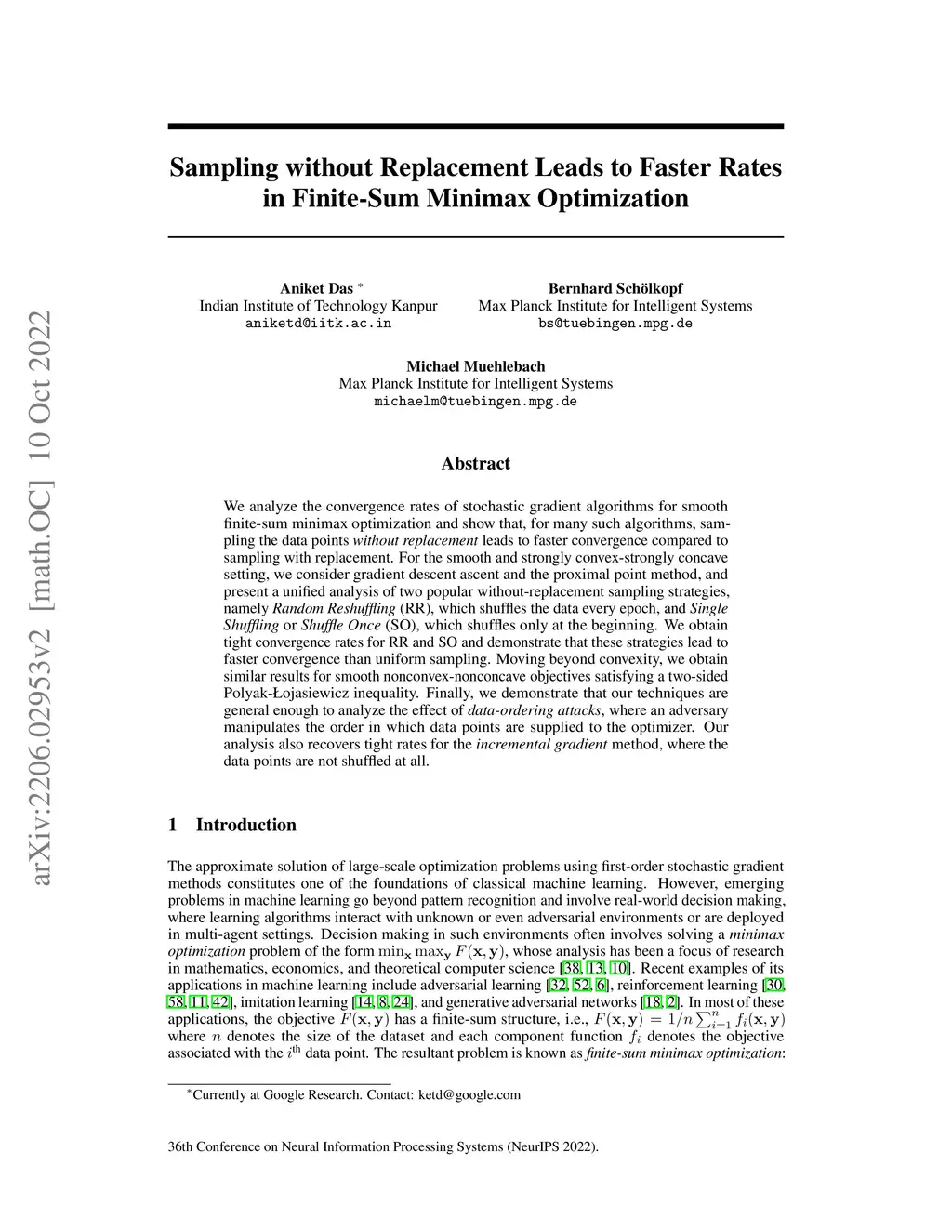 We analyze the convergence rates of stochastic gradient algorithms for smooth finite-sum minimax optimization and show that, for many such algorithms, sampling the data points without replacement leads to faster convergence compared to sampling with replacement. For the smooth and strongly convex-strongly concave setting, we consider gradient descent ascent and the proximal point method, and present a unified analysis of two popular without-replacement sampling strategies, namely Random Reshuffling (RR), which shuffles the data every epoch, and Single Shuffling or Shuffle Once (SO), which shuffles only at the beginning. We obtain tight convergence rates for RR and SO and demonstrate that these strategies lead to faster convergence than uniform sampling. Moving beyond convexity, we obtain similar results for smooth nonconvex-nonconcave objectives satisfying a two-sided Polyak-{\L}ojasiewicz inequality. Finally, we demonstrate that our techniques are general enough to analyze the effect of data-ordering attacks, where an adversary manipulates the order in which data points are supplied to the optimizer. Our analysis also recovers tight rates for the incremental gradient method, where the data points are not shuffled at all.
