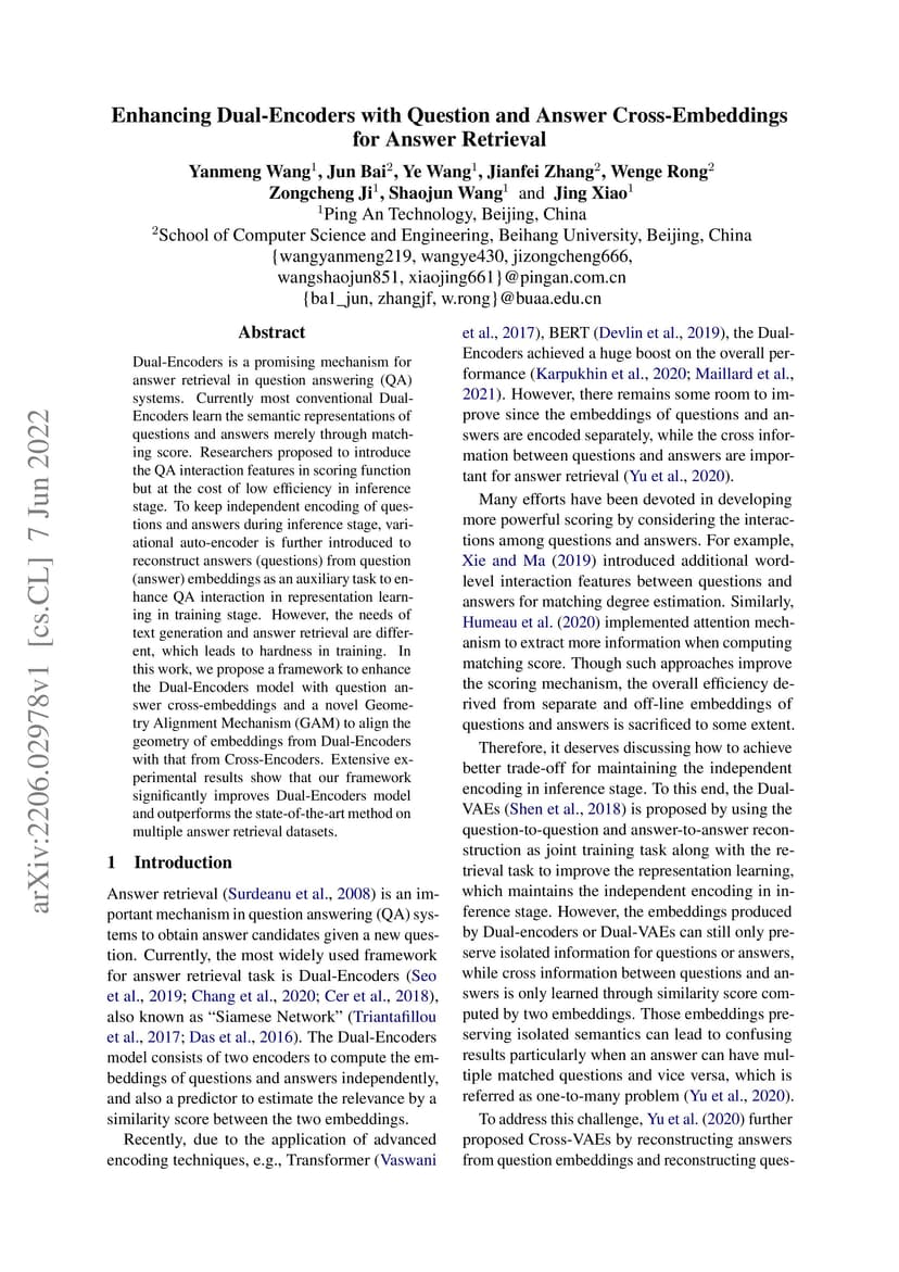 Dual-Encoders is a promising mechanism for answer retrieval in question answering (QA) systems. Currently most conventional Dual-Encoders learn the semantic representations of questions and answers merely through matching score. Researchers proposed to introduce the QA interaction features in scoring function but at the cost of low efficiency in inference stage. To keep independent encoding of questions and answers during inference stage, variational auto-encoder is further introduced to reconstruct answers (questions) from question (answer) embeddings as an auxiliary task to enhance QA interaction in representation learning in training stage. However, the needs of text generation and answer retrieval are different, which leads to hardness in training. In this work, we propose a framework to enhance the Dual-Encoders model with question answer cross-embeddings and a novel Geometry Alignment Mechanism (GAM) to align the geometry of embeddings from Dual-Encoders with that from Cross-Encoders. Extensive experimental results show that our framework significantly improves Dual-Encoders model and outperforms the state-of-the-art method on multiple answer retrieval datasets.