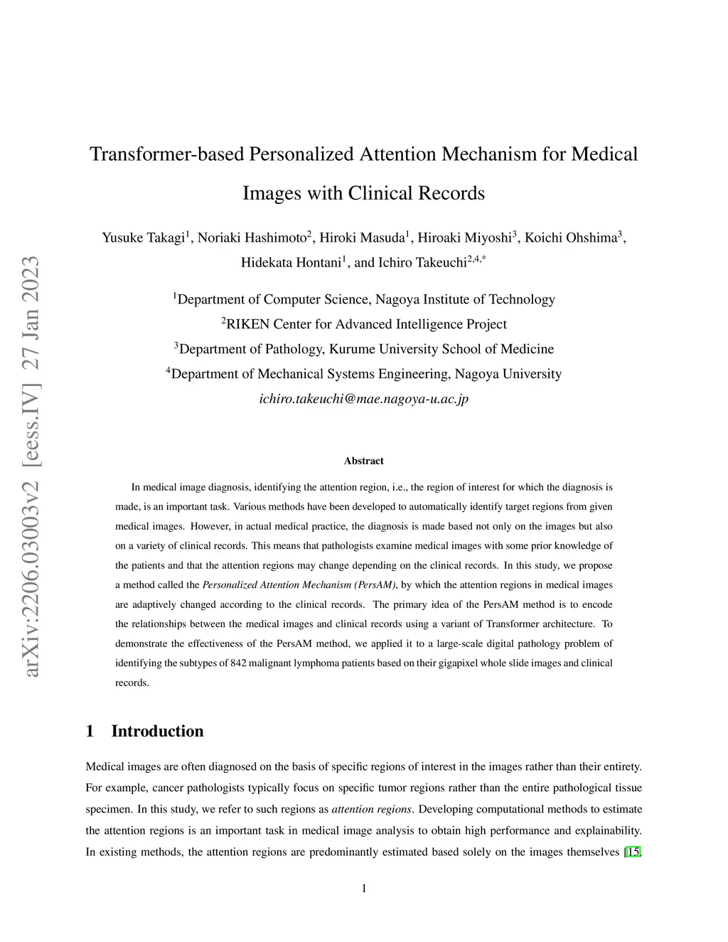 In medical image diagnosis, identifying the attention region, i.e., the region of interest for which the diagnosis is made, is an important task. Various methods have been developed to automatically identify target regions from given medical images. However, in actual medical practice, the diagnosis is made based not only on the images but also on a variety of clinical records. This means that pathologists examine medical images with some prior knowledge of the patients and that the attention regions may change depending on the clinical records. In this study, we propose a method called the Personalized Attention Mechanism (PersAM), by which the attention regions in medical images are adaptively changed according to the clinical records. The primary idea of the PersAM method is to encode the relationships between the medical images and clinical records using a variant of Transformer architecture. To demonstrate the effectiveness of the PersAM method, we applied it to a large-scale digital pathology problem of identifying the subtypes of 842 malignant lymphoma patients based on their gigapixel whole slide images and clinical records.
