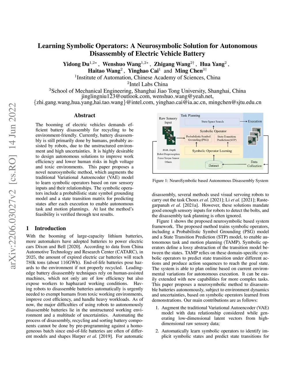 The booming of electric vehicles demands efficient battery disassembly for recycling to be environment-friendly. Currently, battery disassembly is still primarily done by humans, probably assisted by robots, due to the unstructured environment and high uncertainties. It is highly desirable to design autonomous solutions to improve work efficiency and lower human risks in high voltage and toxic environments. This paper proposes a novel neurosymbolic method, which augments the traditional Variational Autoencoder (VAE) model to learn symbolic operators based on raw sensory inputs and their relationships. The symbolic operators include a probabilistic state symbol grounding model and a state transition matrix for predicting states after each execution to enable autonomous task and motion planning. At last, the method's feasibility is verified through test results.