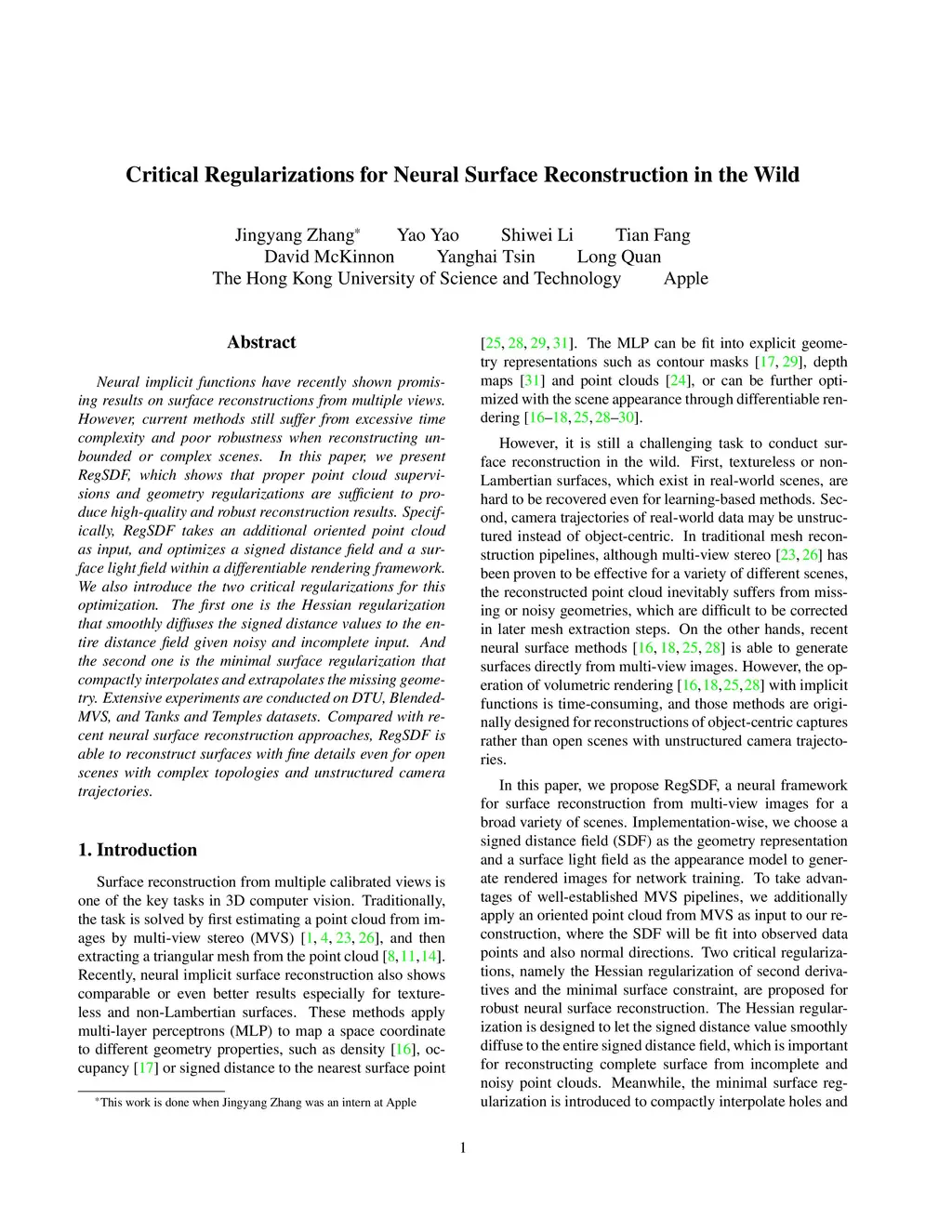 Neural implicit functions have recently shown promising results on surface reconstructions from multiple views. However, current methods still suffer from excessive time complexity and poor robustness when reconstructing unbounded or complex scenes. In this paper, we present RegSDF, which shows that proper point cloud supervisions and geometry regularizations are sufficient to produce high-quality and robust reconstruction results. Specifically, RegSDF takes an additional oriented point cloud as input, and optimizes a signed distance field and a surface light field within a differentiable rendering framework. We also introduce the two critical regularizations for this optimization. The first one is the Hessian regularization that smoothly diffuses the signed distance values to the entire distance field given noisy and incomplete input. And the second one is the minimal surface regularization that compactly interpolates and extrapolates the missing geometry. Extensive experiments are conducted on DTU, BlendedMVS, and Tanks and Temples datasets. Compared with recent neural surface reconstruction approaches, RegSDF is able to reconstruct surfaces with fine details even for open scenes with complex topologies and unstructured camera trajectories.