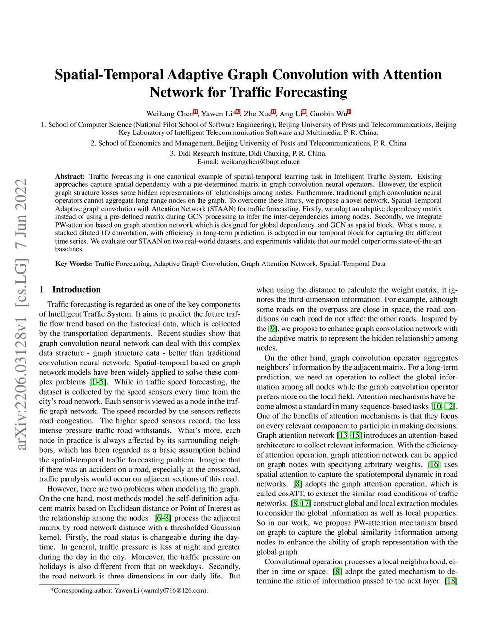 Traffic forecasting is one canonical example of spatial-temporal learning task in Intelligent Traffic System. Existing approaches capture spatial dependency with a pre-determined matrix in graph convolution neural operators. However, the explicit graph structure losses some hidden representations of relationships among nodes. Furthermore, traditional graph convolution neural operators cannot aggregate long-range nodes on the graph. To overcome these limits, we propose a novel network, Spatial-Temporal Adaptive graph convolution with Attention Network (STAAN) for traffic forecasting. Firstly, we adopt an adaptive dependency matrix instead of using a pre-defined matrix during GCN processing to infer the inter-dependencies among nodes. Secondly, we integrate PW-attention based on graph attention network which is designed for global dependency, and GCN as spatial block. What's more, a stacked dilated 1D convolution, with efficiency in long-term prediction, is adopted in our temporal block for capturing the different time series. We evaluate our STAAN on two real-world datasets, and experiments validate that our model outperforms state-of-the-art baselines.