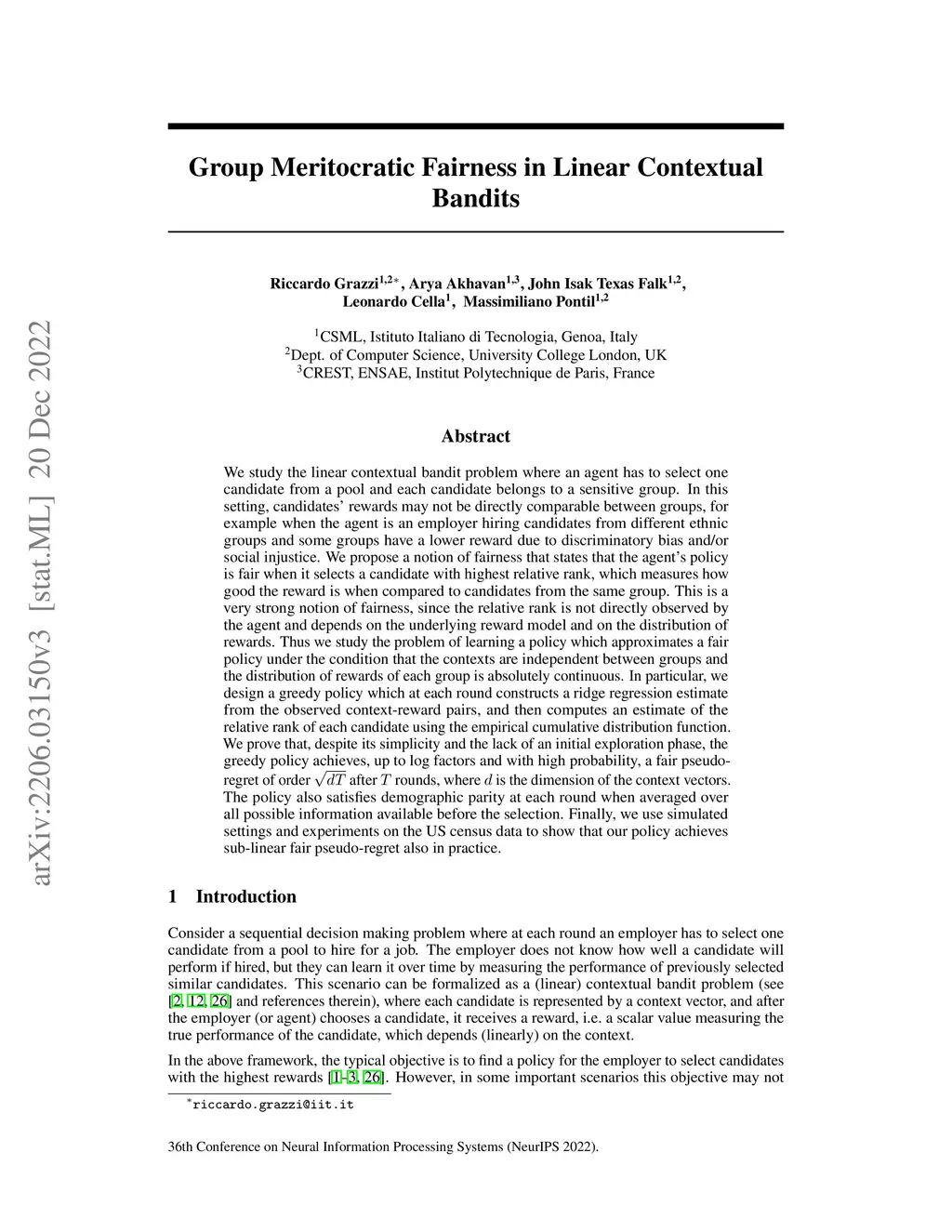 We study the linear contextual bandit problem where an agent has to select one candidate from a pool and each candidate belongs to a sensitive group. In this setting, candidates' rewards may not be directly comparable between groups, for example when the agent is an employer hiring candidates from different ethnic groups and some groups have a lower reward due to discriminatory bias and/or social injustice. We propose a notion of fairness that states that the agent's policy is fair when it selects a candidate with highest relative rank, which measures how good the reward is when compared to candidates from the same group. This is a very strong notion of fairness, since the relative rank is not directly observed by the agent and depends on the underlying reward model and on the distribution of rewards. Thus we study the problem of learning a policy which approximates a fair policy under the condition that the contexts are independent between groups and the distribution of rewards of each group is absolutely continuous. In particular, we design a greedy policy which at each round constructs a ridge regression estimate from the observed context-reward pairs, and then computes an estimate of the relative rank of each candidate using the empirical cumulative distribution function. We prove that, despite its simplicity and the lack of an initial exploration phase, the greedy policy achieves, up to log factors and with high probability, a fair pseudo-regret of order after rounds, where is the dimension of the context vectors. The policy also satisfies demographic parity at each round when averaged over all possible information available before the selection. Finally, we use simulated settings and experiments on the US census data to show that our policy achieves sub-linear fair pseudo-regret also in practice.