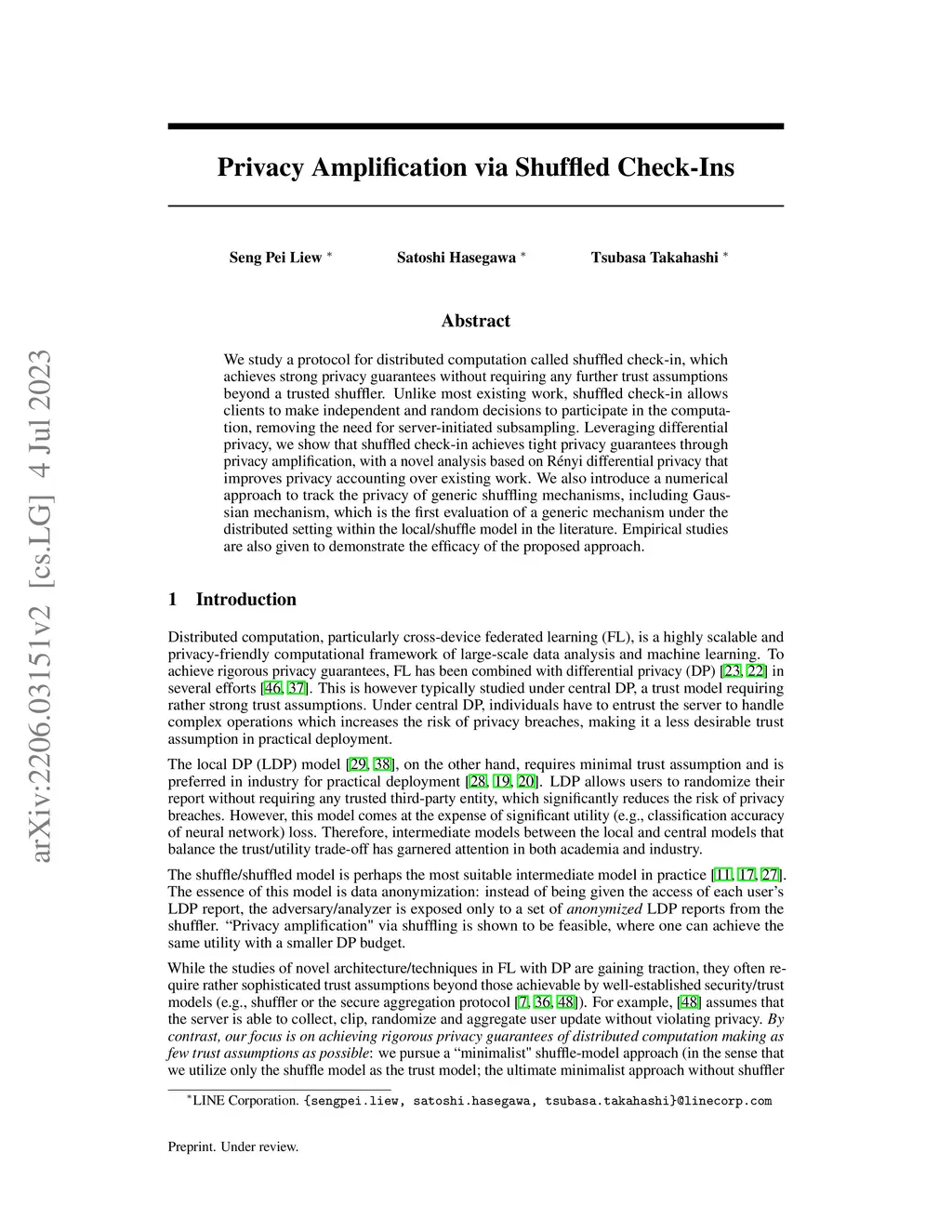 We study a protocol for distributed computation called shuffled check-in, which achieves strong privacy guarantees without requiring any further trust assumptions beyond a trusted shuffler. Unlike most existing work, shuffled check-in allows clients to make independent and random decisions to participate in the computation, removing the need for server-initiated subsampling. Leveraging differential privacy, we show that shuffled check-in achieves tight privacy guarantees through privacy amplification, with a novel analysis based on R{\é}nyi differential privacy that improves privacy accounting over existing work. We also introduce a numerical approach to track the privacy of generic shuffling mechanisms, including Gaussian mechanism, which is the first evaluation of a generic mechanism under the distributed setting within the local/shuffle model in the literature. Empirical studies are also given to demonstrate the efficacy of the proposed approach.