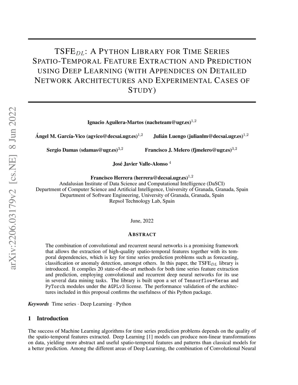 The combination of convolutional and recurrent neural networks is a promising framework that allows the extraction of high-quality spatio-temporal features together with its temporal dependencies, which is key for time series prediction problems such as forecasting, classification or anomaly detection, amongst others. In this paper, the TSFEDL library is introduced. It compiles 20 state-of-the-art methods for both time series feature extraction and prediction, employing convolutional and recurrent deep neural networks for its use in several data mining tasks. The library is built upon a set of Tensorflow+Keras and PyTorch modules under the AGPLv3 license. The performance validation of the architectures included in this proposal confirms the usefulness of this Python package.