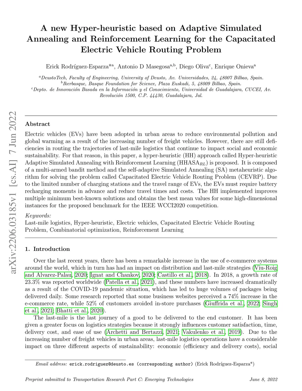 Electric vehicles (EVs) have been adopted in urban areas to reduce environmental pollution and global warming as a result of the increasing number of freight vehicles. However, there are still deficiencies in routing the trajectories of last-mile logistics that continue to impact social and economic sustainability. For that reason, in this paper, a hyper-heuristic (HH) approach called Hyper-heuristic Adaptive Simulated Annealing with Reinforcement Learning (HHASA) is proposed. It is composed of a multi-armed bandit method and the self-adaptive Simulated Annealing (SA) metaheuristic algorithm for solving the problem called Capacitated Electric Vehicle Routing Problem (CEVRP). Due to the limited number of charging stations and the travel range of EVs, the EVs must require battery recharging moments in advance and reduce travel times and costs. The HH implemented improves multiple minimum best-known solutions and obtains the best mean values for some high-dimensional instances for the proposed benchmark for the IEEE WCCI2020 competition.