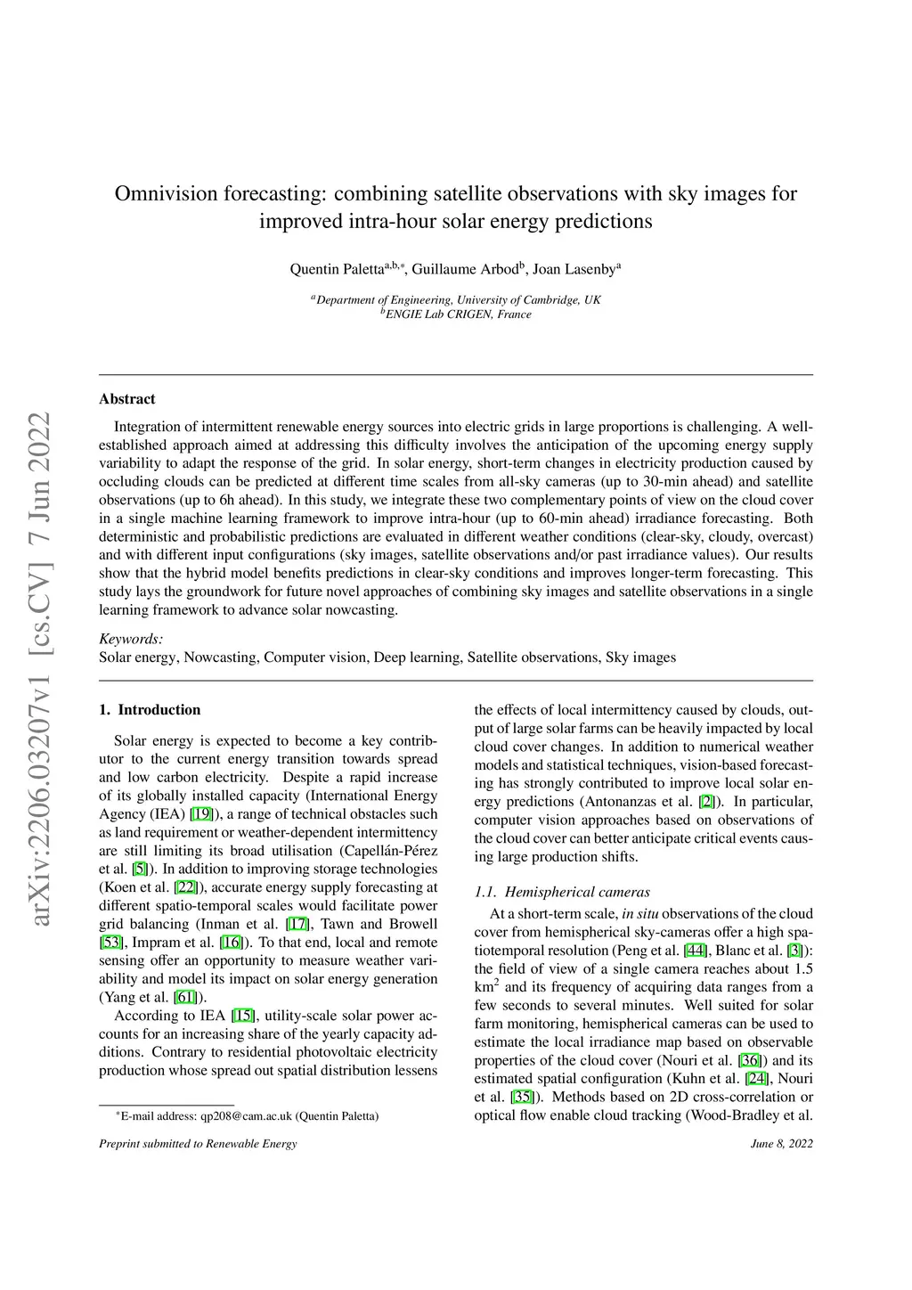 for improved intra-hour solar energy predictions