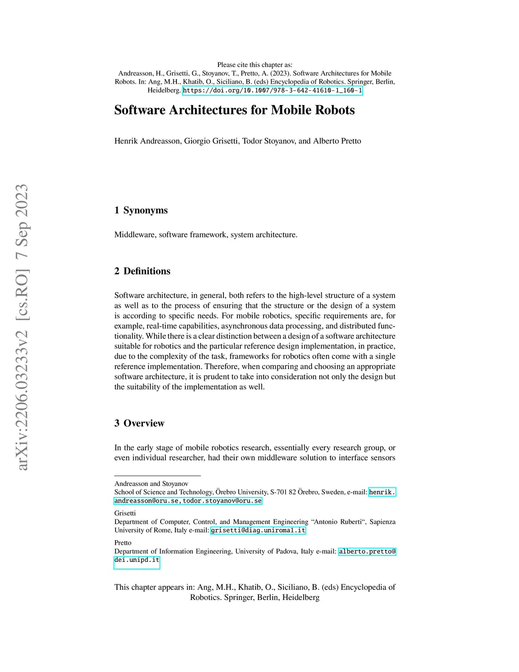 A software architecture defines the blueprints of a large computational system, and is thus a crucial part of the design and development effort. This task has been explored extensively in the context of mobile robots, resulting in a plethora of reference designs and implementations. As the software architecture defines the framework in which all components are implemented, it is naturally a very important aspect of a mobile robot system. In this chapter, we overview the requirements that the particular problem domain (a mobile robot system) imposes on the software framework. We discuss some of the current design solutions, provide a historical perspective on common frameworks, and outline directions for future development.