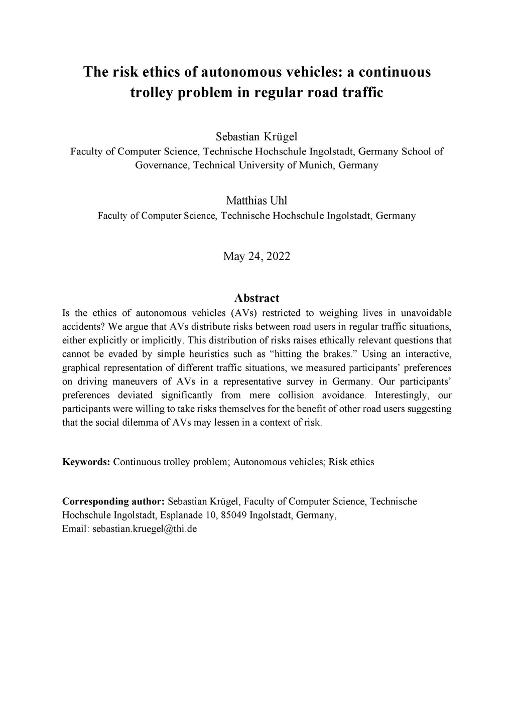 The risk ethics of autonomous vehicles: a continuous trolley problem in