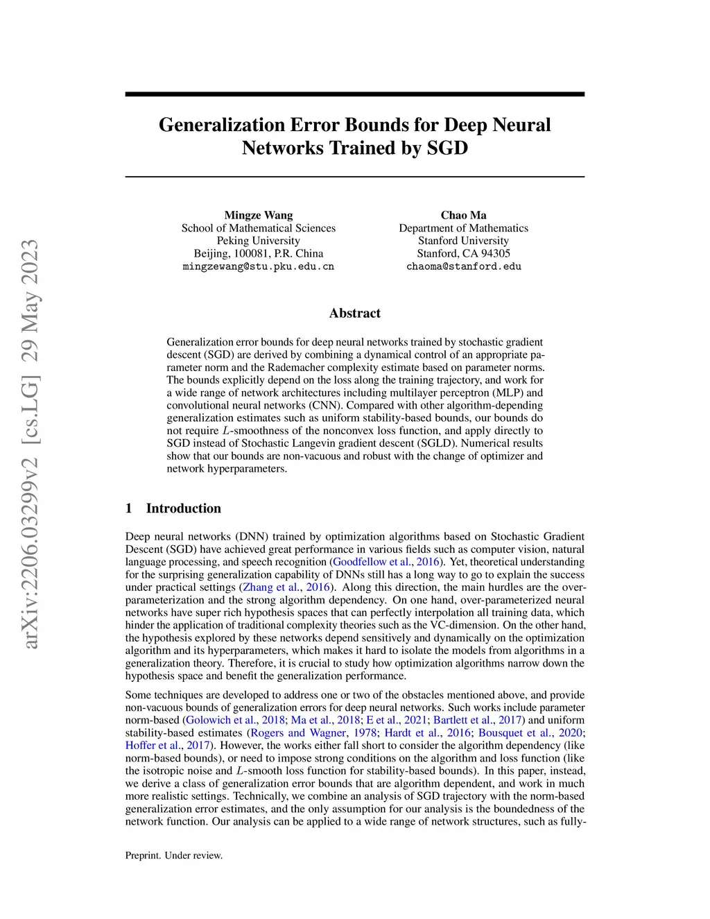 Generalization error bounds for deep neural networks trained by stochastic gradient descent (SGD) are derived by combining a dynamical control of an appropriate parameter norm and the Rademacher complexity estimate based on parameter norms. The bounds explicitly depend on the loss along the training trajectory, and work for a wide range of network architectures including multilayer perceptron (MLP) and convolutional neural networks (CNN). Compared with other algorithm-depending generalization estimates such as uniform stability-based bounds, our bounds do not require -smoothness of the nonconvex loss function, and apply directly to SGD instead of Stochastic Langevin gradient descent (SGLD). Numerical results show that our bounds are non-vacuous and robust with the change of optimizer and network hyperparameters.