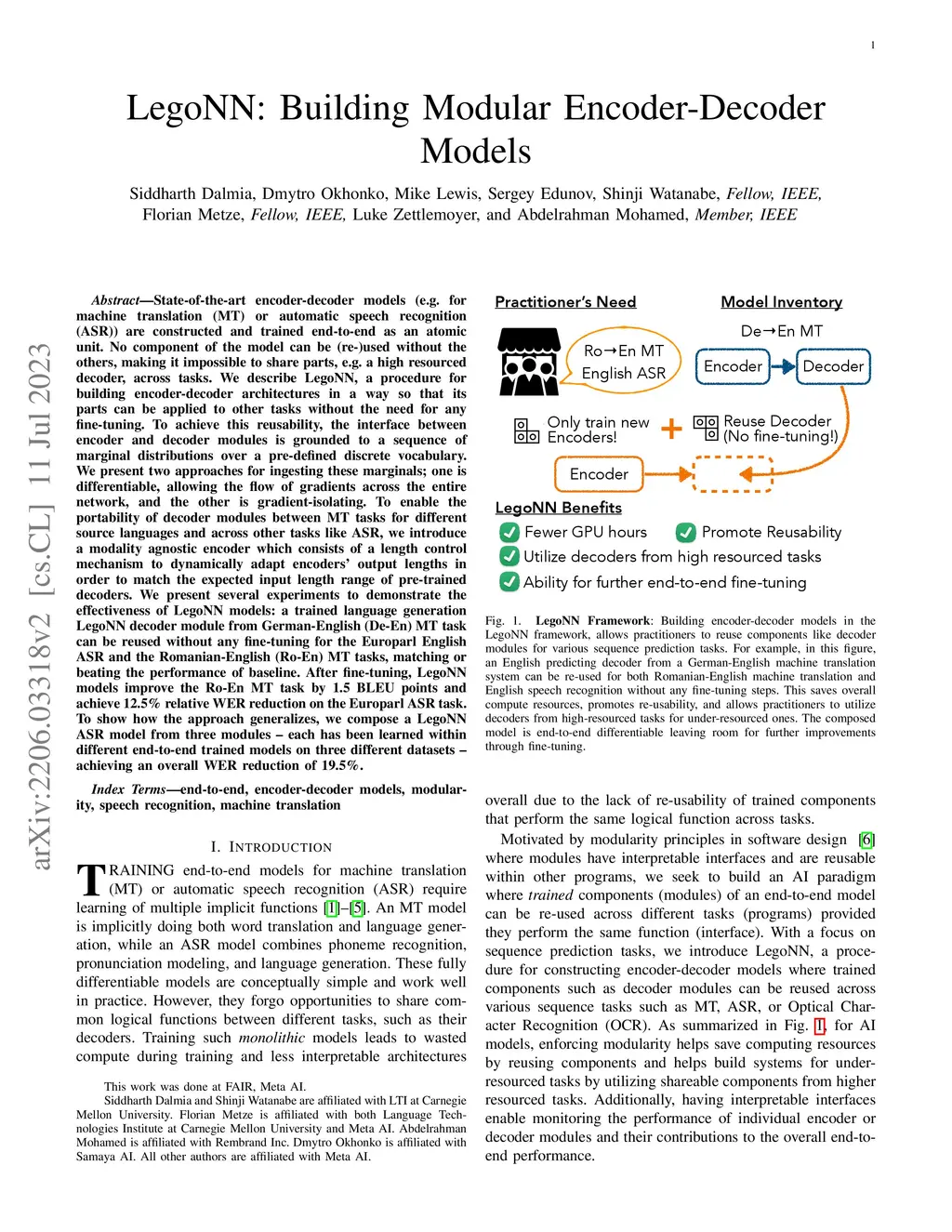 State-of-the-art encoder-decoder models (e.g. for machine translation (MT) or speech recognition (ASR)) are constructed and trained end-to-end as an atomic unit. No component of the model can be (re-)used without the others. We describe LegoNN, a procedure for building encoder-decoder architectures with decoder modules that can be reused across various MT and ASR tasks, without the need for any fine-tuning. To achieve reusability, the interface between each encoder and decoder modules is grounded to a sequence of marginal distributions over a discrete vocabulary pre-defined by the model designer. We present two approaches for ingesting these marginals; one is differentiable, allowing the flow of gradients across the entire network, and the other is gradient-isolating. To enable portability of decoder modules between MT tasks for different source languages and across other tasks like ASR, we introduce a modality agnostic encoder which consists of a length control mechanism to dynamically adapt encoders' output lengths in order to match the expected input length range of pre-trained decoders. We present several experiments to demonstrate the effectiveness of LegoNN models: a trained language generation LegoNN decoder module from German-English (De-En) MT task can be reused with no fine-tuning for the Europarl English ASR and the Romanian-English (Ro-En) MT tasks to match or beat respective baseline models. When fine-tuned towards the target task for few thousand updates, our LegoNN models improved the Ro-En MT task by 1.5 BLEU points, and achieved 12.5% relative WER reduction for the Europarl ASR task. Furthermore, to show its extensibility, we compose a LegoNN ASR model from three modules -- each has been learned within different end-to-end trained models on three different datasets -- boosting the WER reduction to 19.5%.