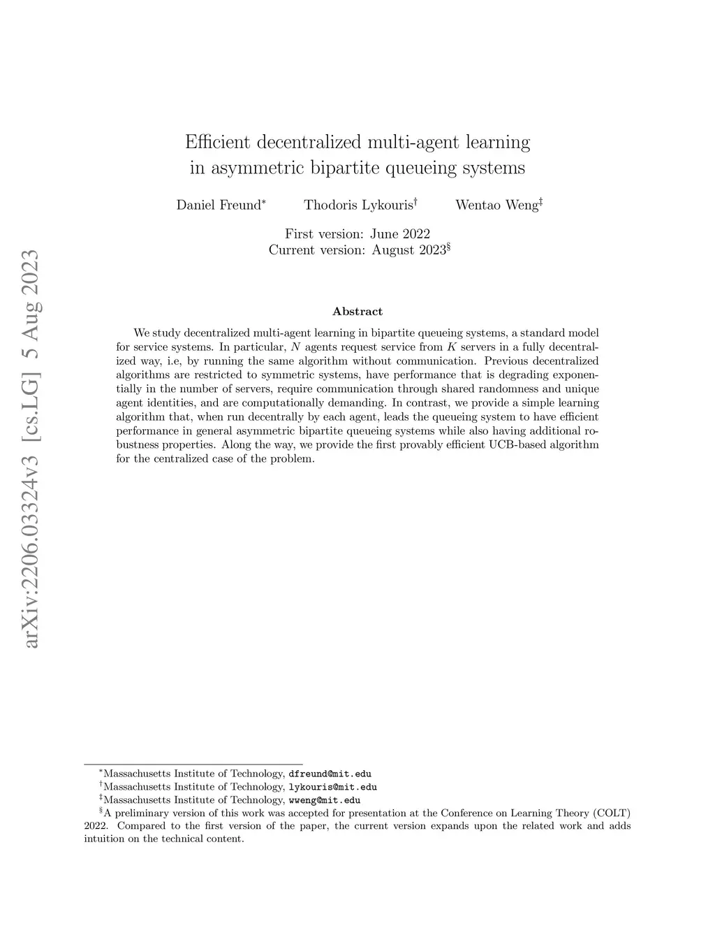 We study decentralized multi-agent learning in bipartite queueing systems, a standard model for service systems. In particular, N agents request service from K servers in a fully decentralized way, i.e, by running the same algorithm without communication. Previous decentralized algorithms are restricted to symmetric systems, have performance that is degrading exponentially in the number of servers, require communication through shared randomness and unique agent identities, and are computationally demanding. In contrast, we provide a simple learning algorithm that, when run decentrally by each agent, leads the queueing system to have efficient performance in general asymmetric bipartite queueing systems while also having additional robustness properties. Along the way, we provide the first provably efficient UCB-based algorithm for the centralized case of the problem.