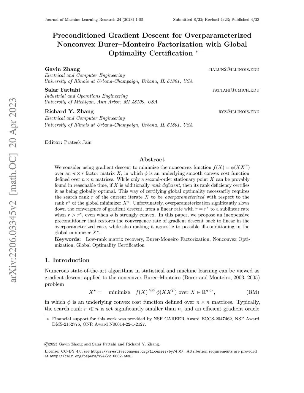 Preconditioned Gradient Descent for Overparameterized Nonconvex Burer--Monteiro Factorization with Global Optimality Certification