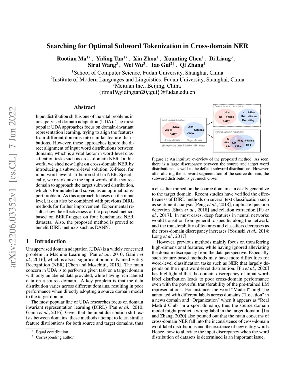 Input distribution shift is one of the vital problems in unsupervised domain adaptation (UDA). The most popular UDA approaches focus on domain-invariant representation learning, trying to align the features from different domains into similar feature distributions. However, these approaches ignore the direct alignment of input word distributions between domains, which is a vital factor in word-level classification tasks such as cross-domain NER. In this work, we shed new light on cross-domain NER by introducing a subword-level solution, X-Piece, for input word-level distribution shift in NER. Specifically, we re-tokenize the input words of the source domain to approach the target subword distribution, which is formulated and solved as an optimal transport problem. As this approach focuses on the input level, it can also be combined with previous DIRL methods for further improvement. Experimental results show the effectiveness of the proposed method based on BERT-tagger on four benchmark NER datasets. Also, the proposed method is proved to benefit DIRL methods such as DANN.
