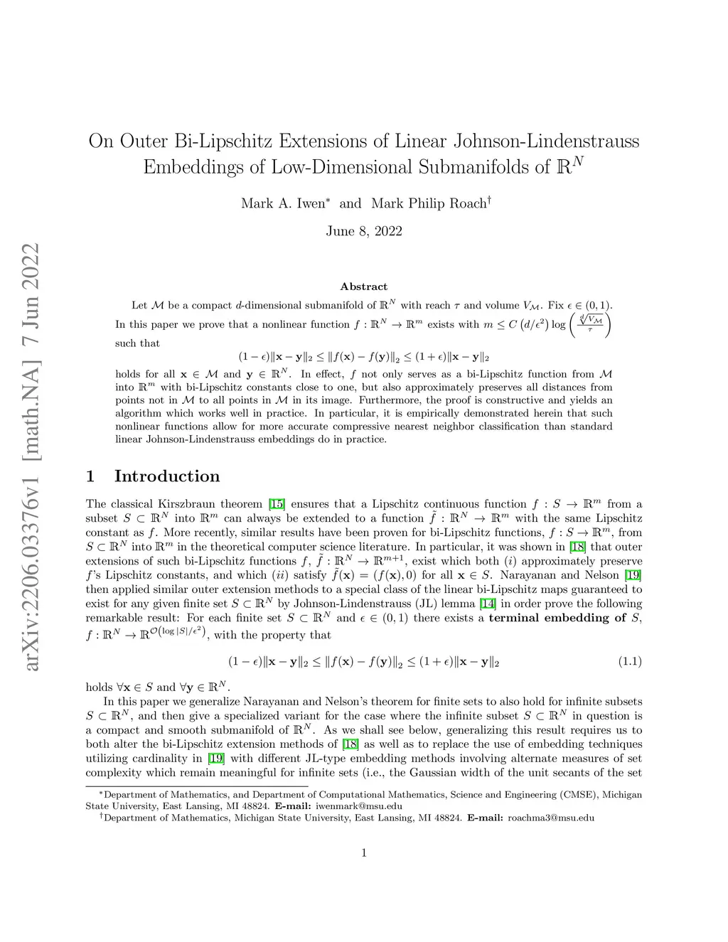Let be a compact -dimensional submanifold of with reach and volume . Fix . In this paper we prove that a nonlinear function exists with such that holds for all and . In effect, not only serves as a bi-Lipschitz function from into with bi-Lipschitz constants close to one, but also approximately preserves all distances from points not in to all points in in its image. Furthermore, the proof is constructive and yields an algorithm which works well in practice. In particular, it is empirically demonstrated herein that such nonlinear functions allow for more accurate compressive nearest neighbor classification than standard linear Johnson-Lindenstrauss embeddings do in practice.