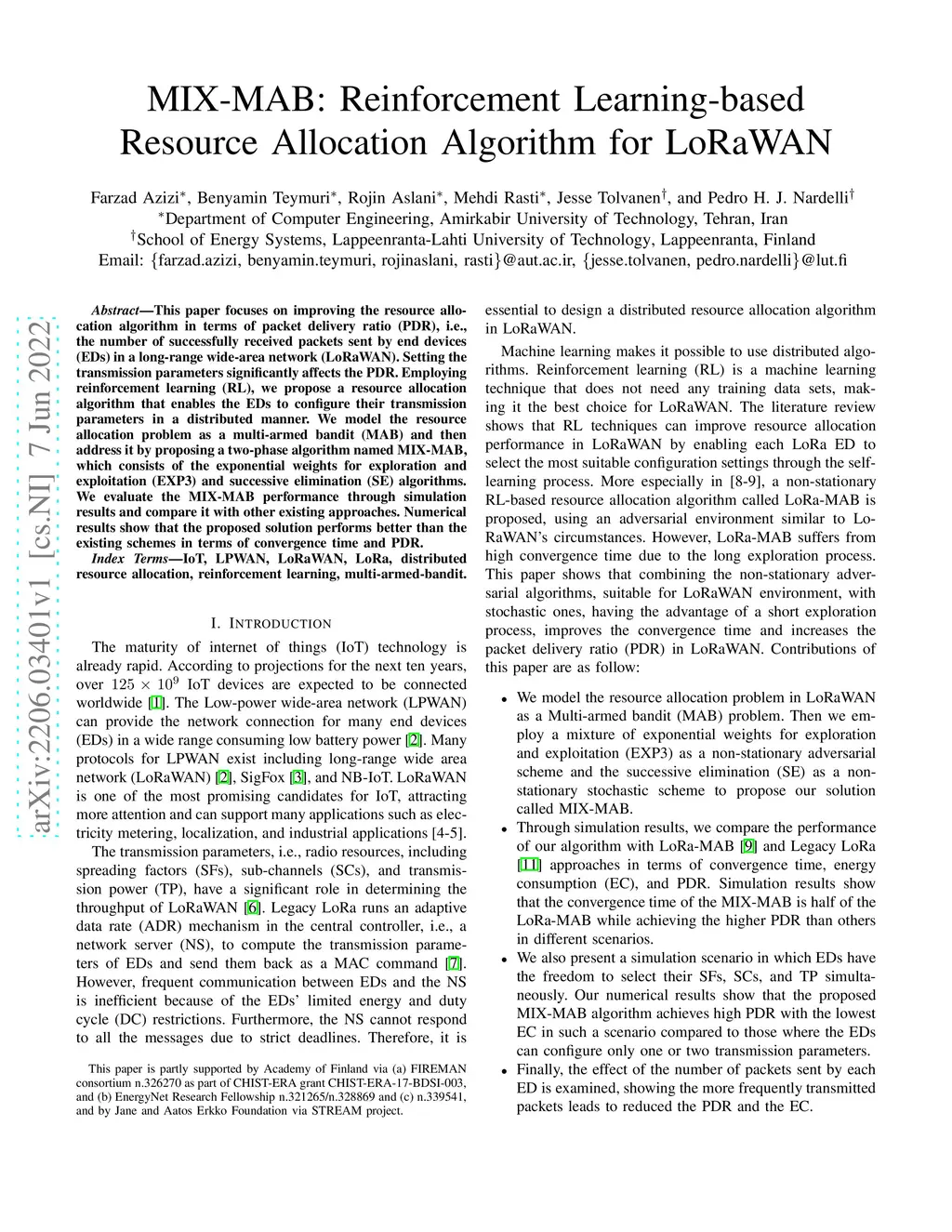 This paper focuses on improving the resource allocation algorithm in terms of packet delivery ratio (PDR), i.e., the number of successfully received packets sent by end devices (EDs) in a long-range wide-area network (LoRaWAN). Setting the transmission parameters significantly affects the PDR. Employing reinforcement learning (RL), we propose a resource allocation algorithm that enables the EDs to configure their transmission parameters in a distributed manner. We model the resource allocation problem as a multi-armed bandit (MAB) and then address it by proposing a two-phase algorithm named MIX-MAB, which consists of the exponential weights for exploration and exploitation (EXP3) and successive elimination (SE) algorithms. We evaluate the MIX-MAB performance through simulation results and compare it with other existing approaches. Numerical results show that the proposed solution performs better than the existing schemes in terms of convergence time and PDR.