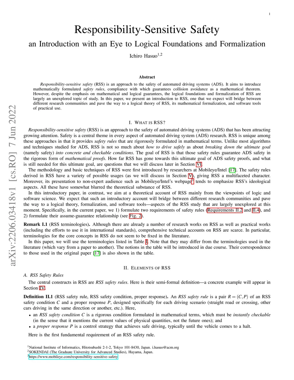 Responsibility-sensitive safety (RSS) is an approach to the safety of automated driving systems (ADS). It aims to introduce mathematically formulated safety rules, compliance with which guarantees collision avoidance as a mathematical theorem. However, despite the emphasis on mathematical and logical guarantees, the logical foundations and formalization of RSS are largely an unexplored topic of study. In this paper, we present an introduction to RSS, one that we expect will bridge between different research communities and pave the way to a logical theory of RSS, its mathematical formalization, and software tools of practical use.